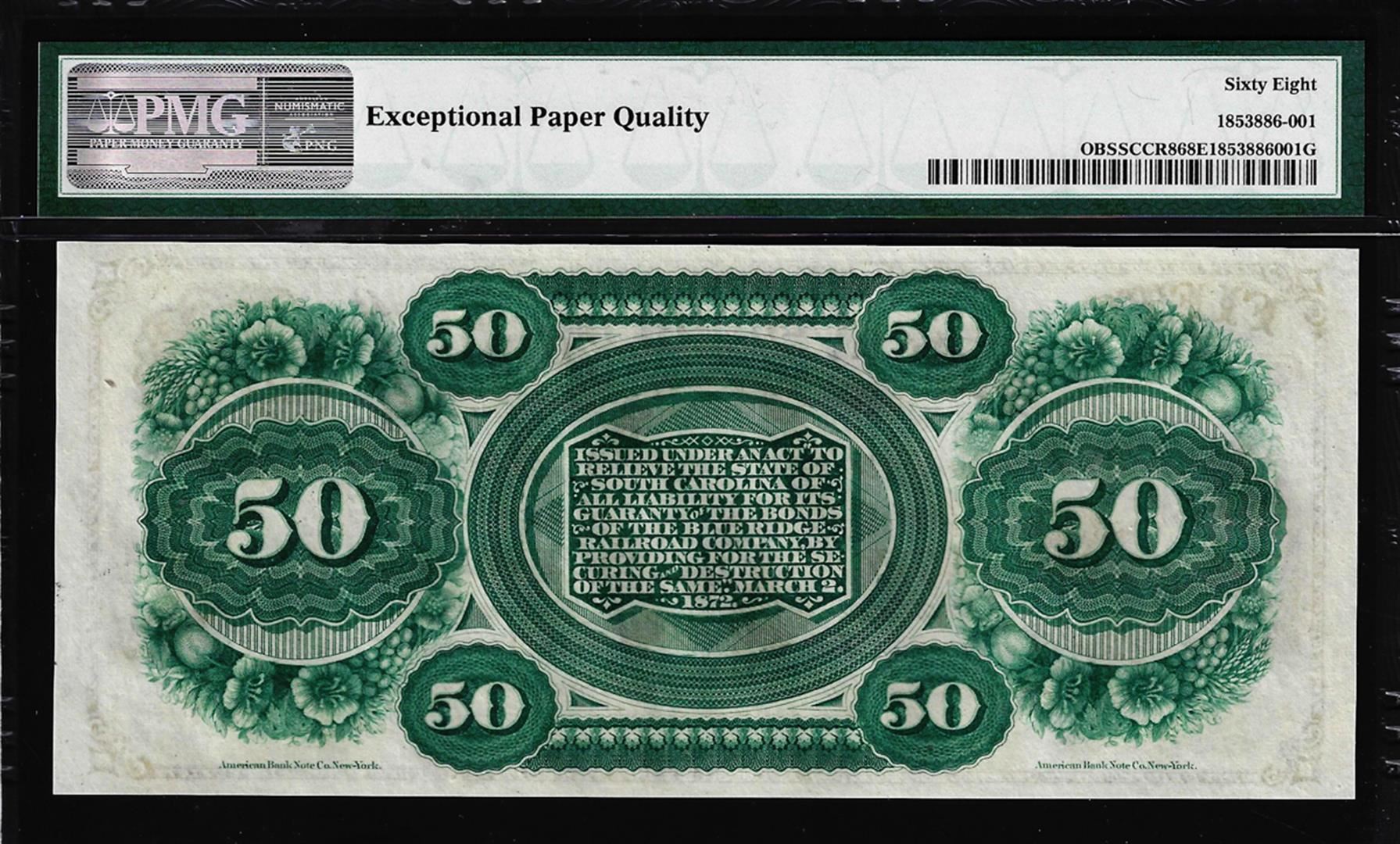 One 1872 $50 State of South Carolina Obsolete Note PMG Superb Gem Unc. 68EPQ Low Serial. PMG Certified.