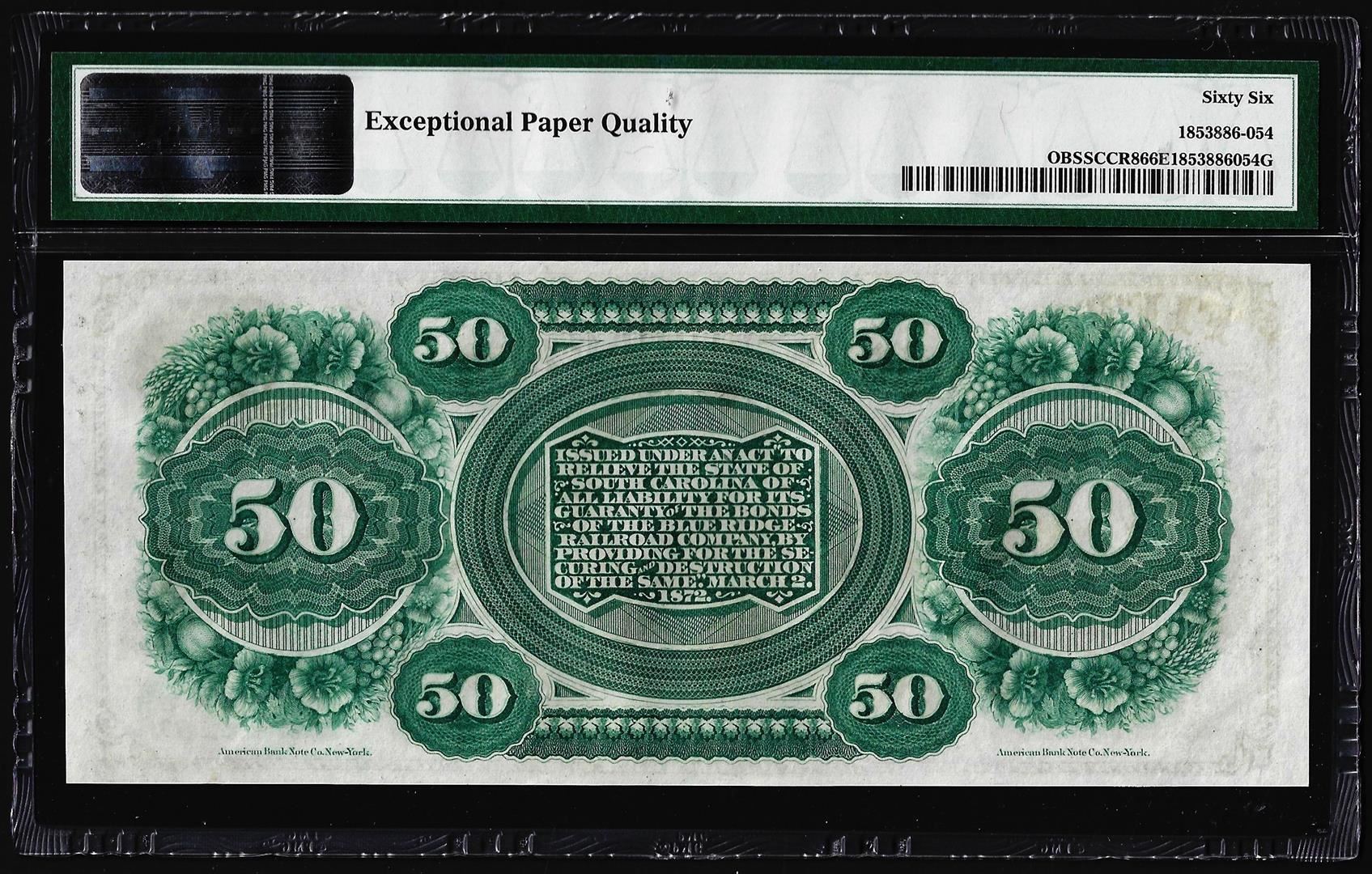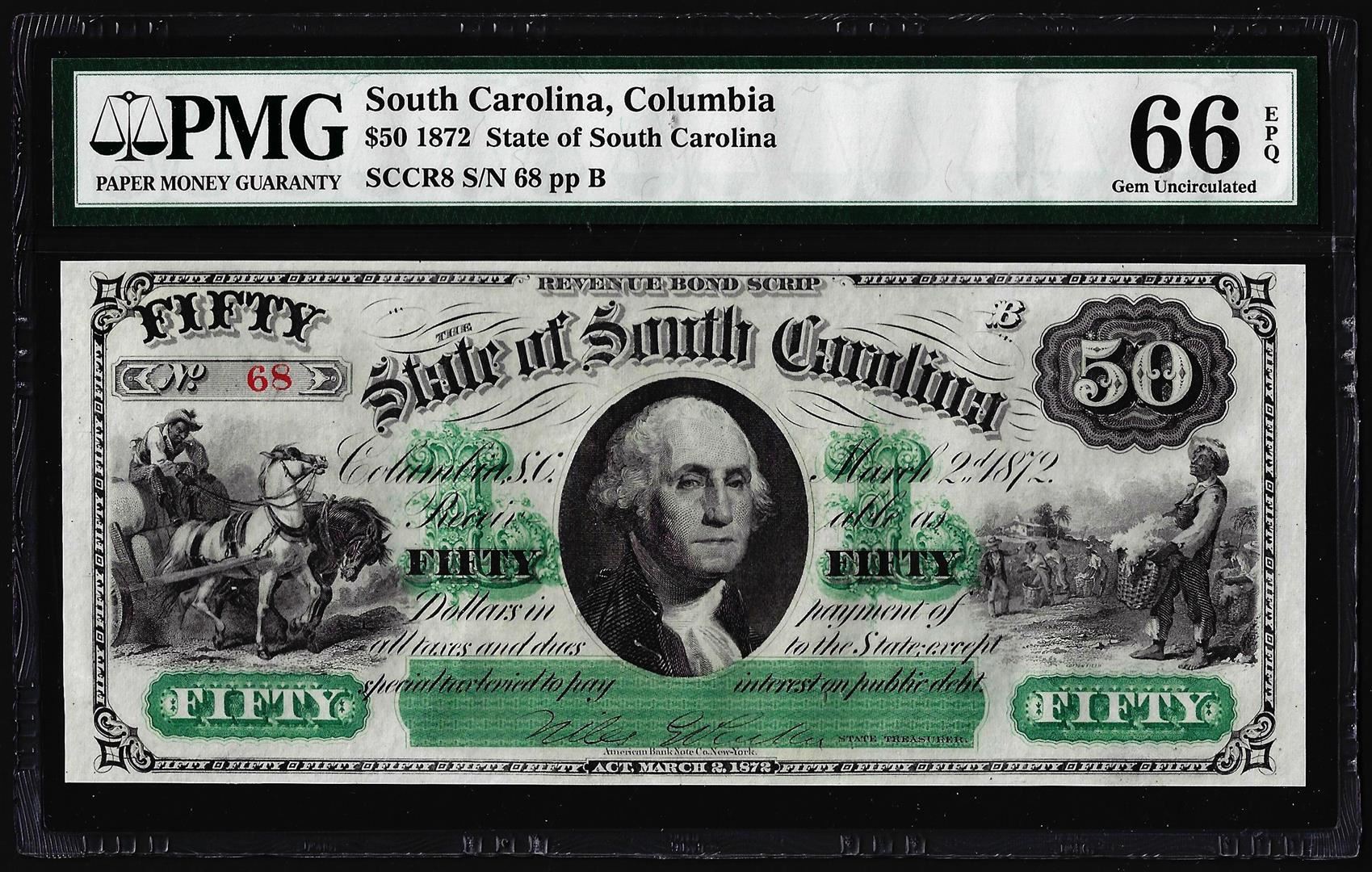 1872 $50 State of South Carolina Revenue Bond Obsolete Note PMG Gem Uncirculated 66EPQ