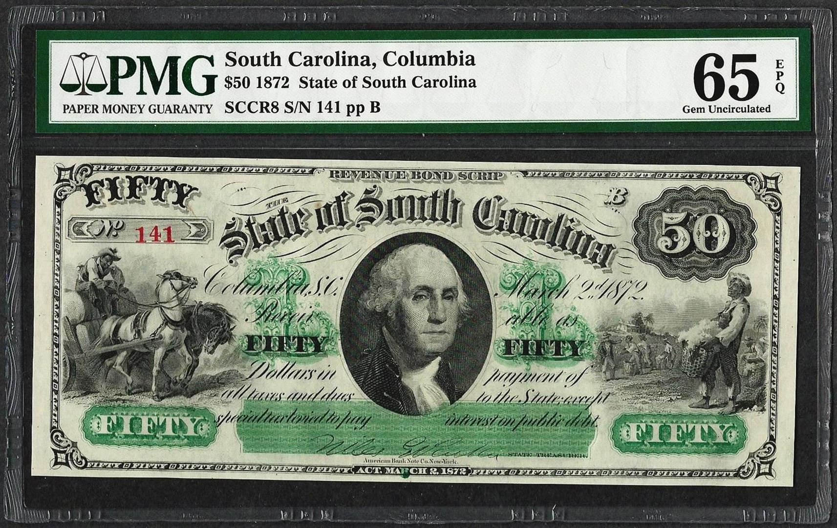 One 1872 $50 State of South Carolina Revenue Bond Obsolete Note PMG Gem Uncirculated 65EPQ. PMG Certified.