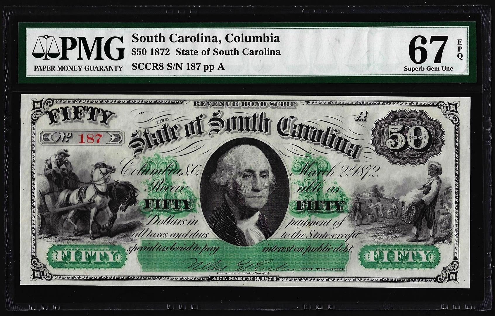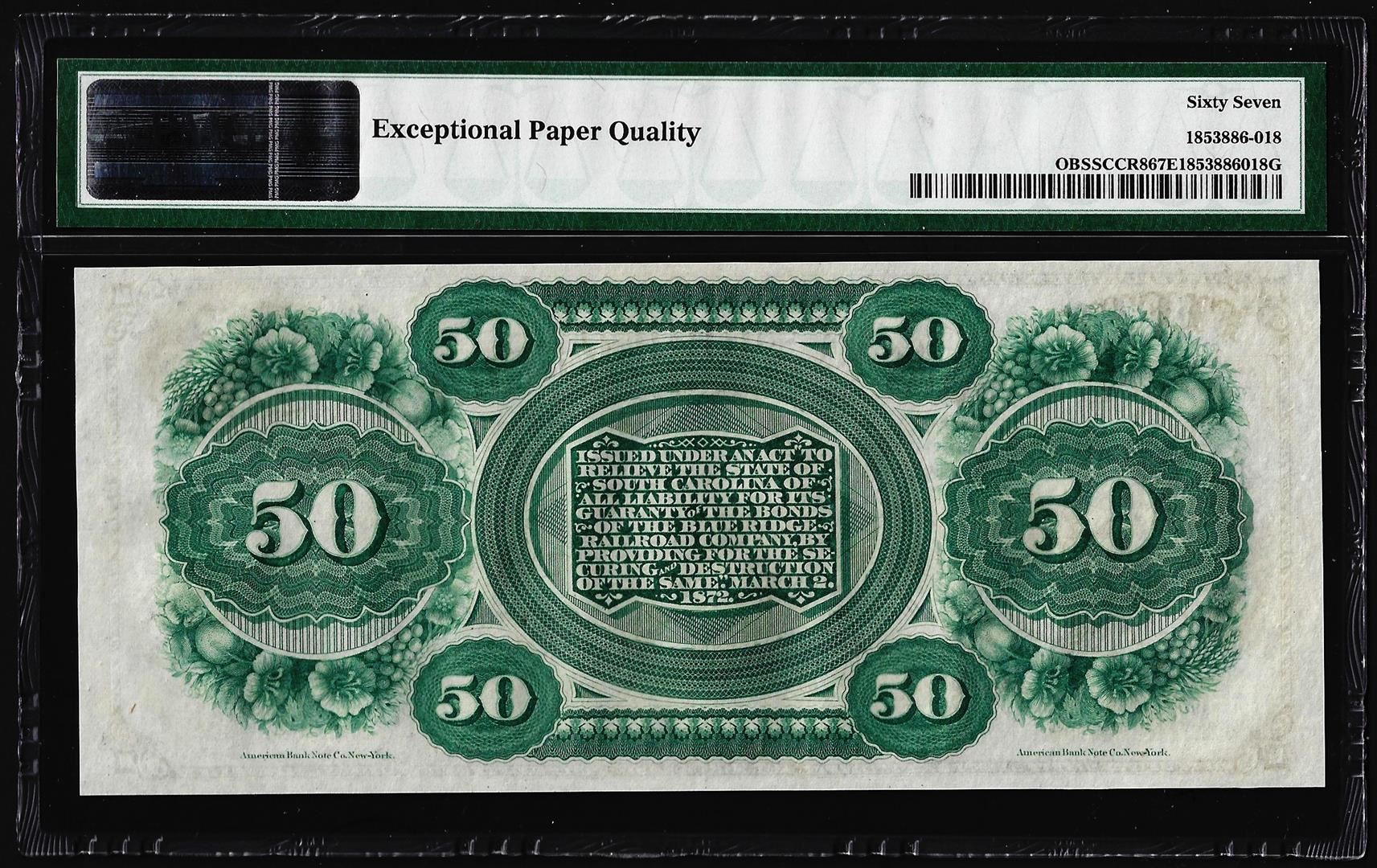 1872 $50 State of South Carolina Revenue Bond Obsolete Note PMG Superb Gem Unc. 67EPQ