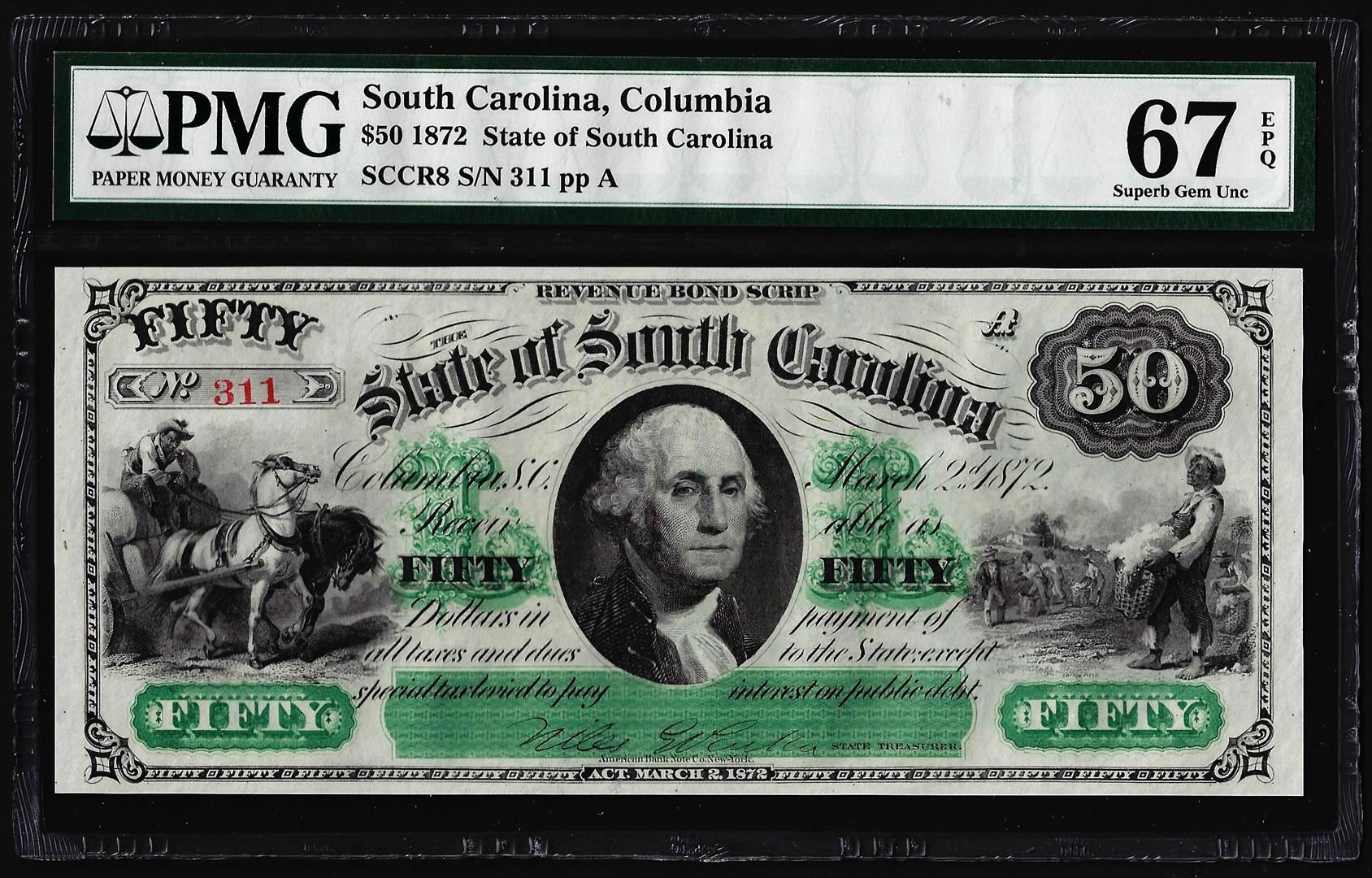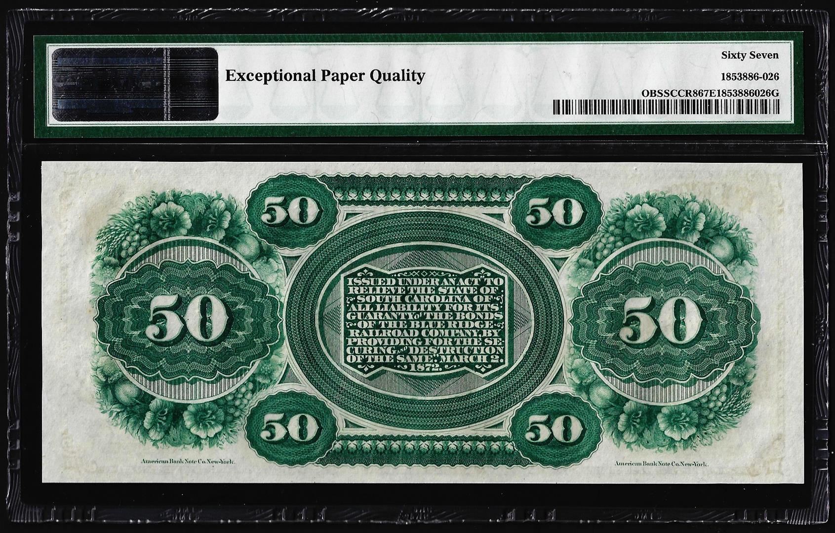 1872 $50 State of South Carolina Revenue Bond Obsolete Note PMG Superb Gem Unc. 67EPQ