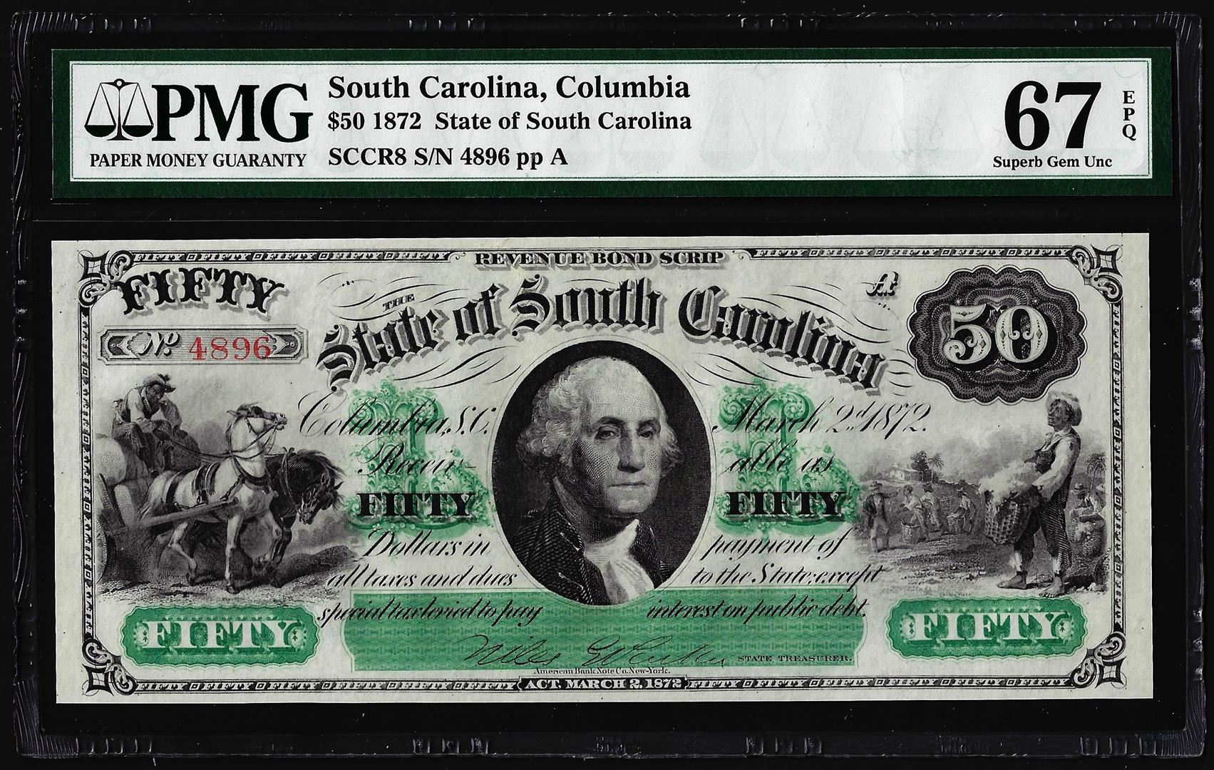 1872 $50 State of South Carolina Revenue Bond Obsolete Note PMG Superb Gem Unc. 67EPQ