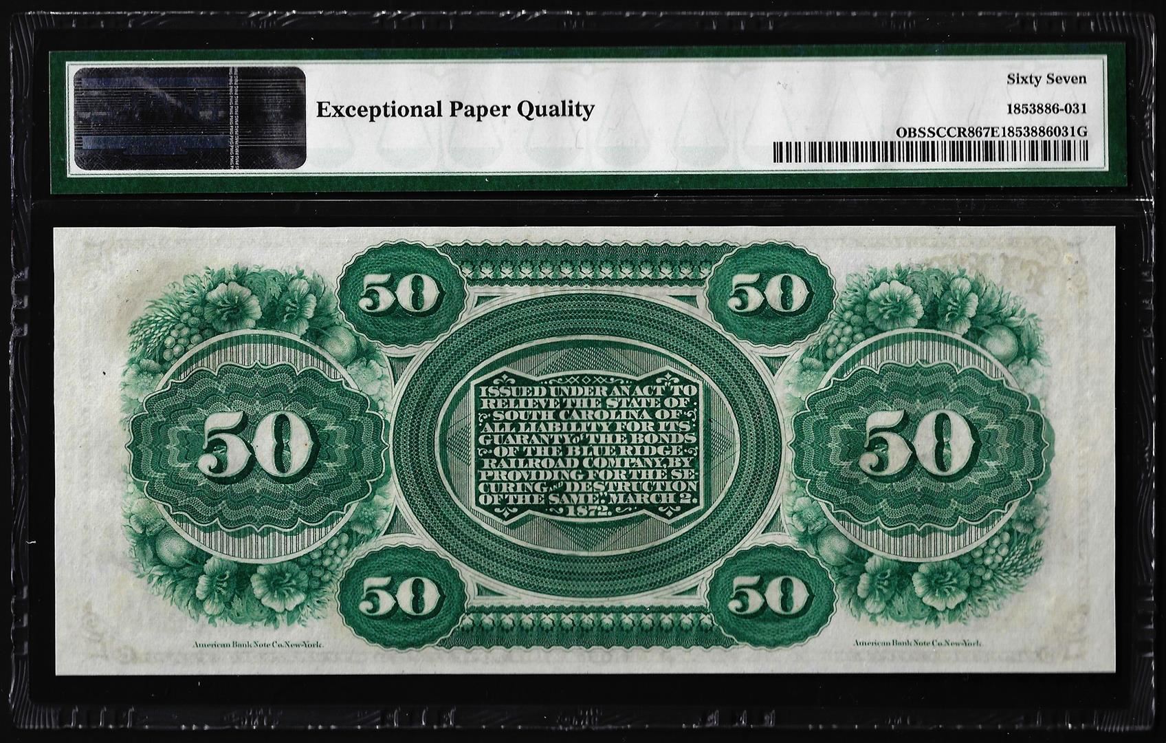 1872 $50 State of South Carolina Revenue Bond Obsolete Note PMG Superb Gem Unc. 67EPQ