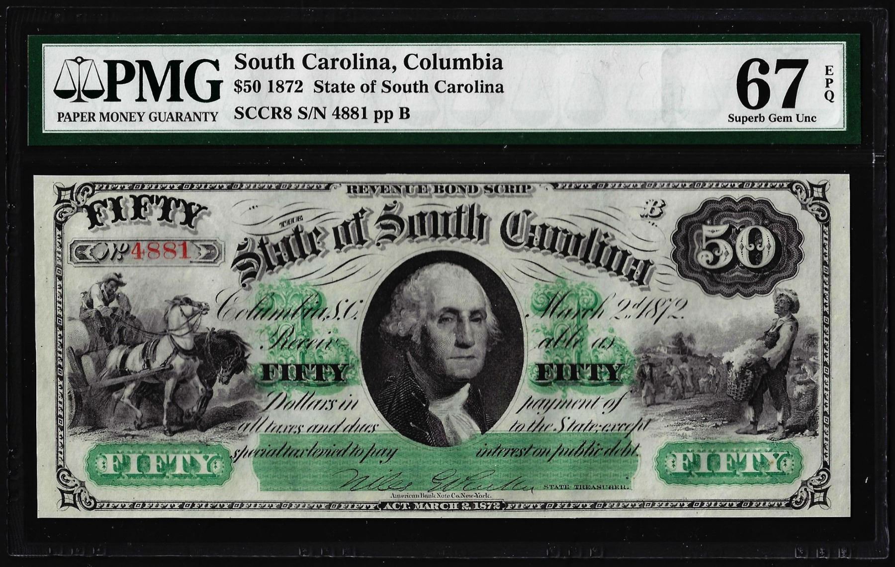 1872 $50 State of South Carolina Revenue Bond Obsolete Note PMG Superb Gem Unc. 67EPQ