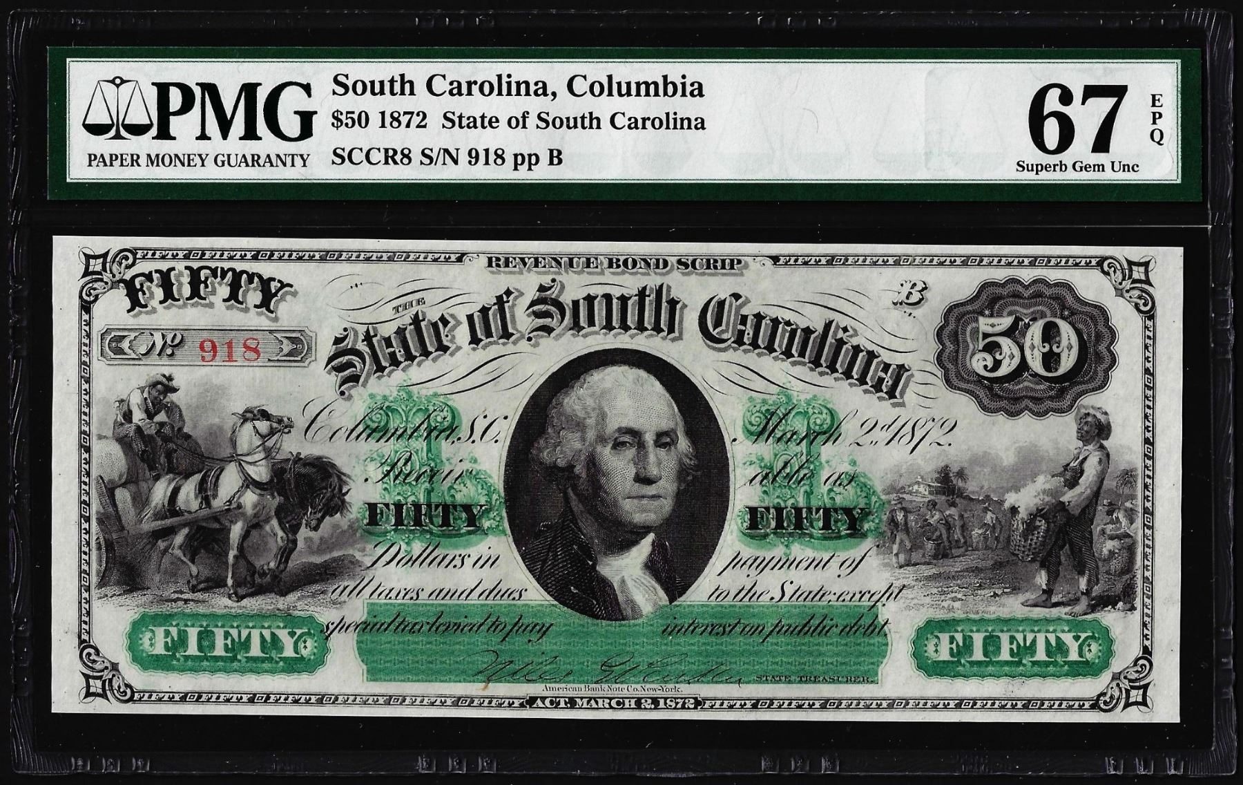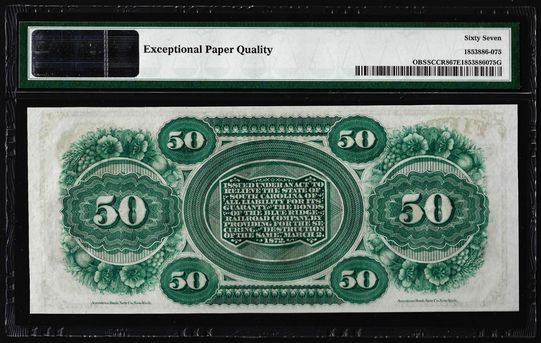 1872 $50 State of South Carolina Revenue Bond Obsolete Note PMG Superb Gem Unc. 67EPQ