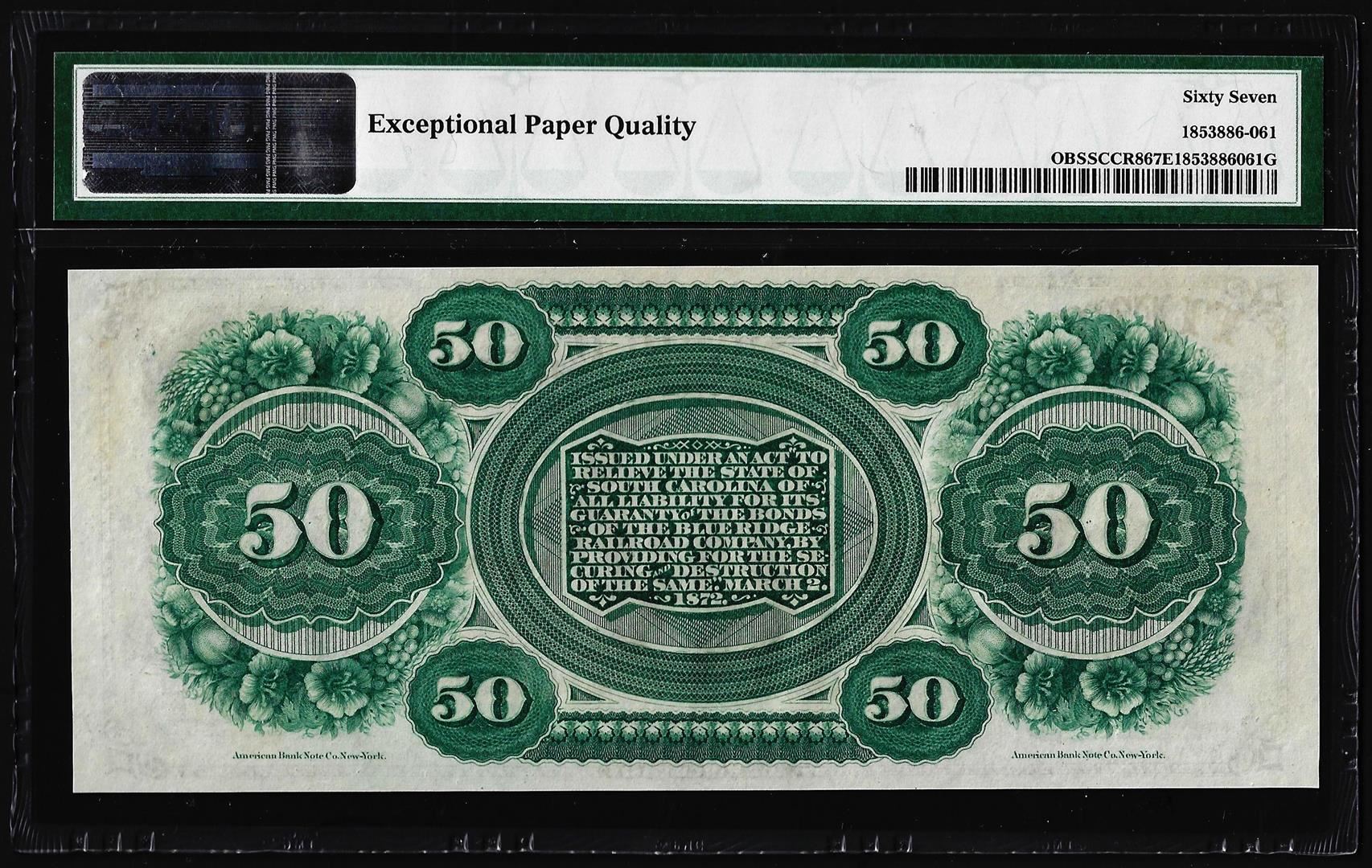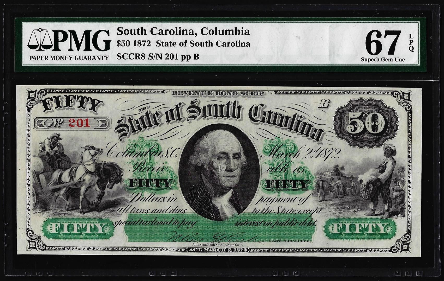 1872 $50 State of South Carolina Revenue Bond Obsolete Note PMG Superb Gem Unc. 67EPQ