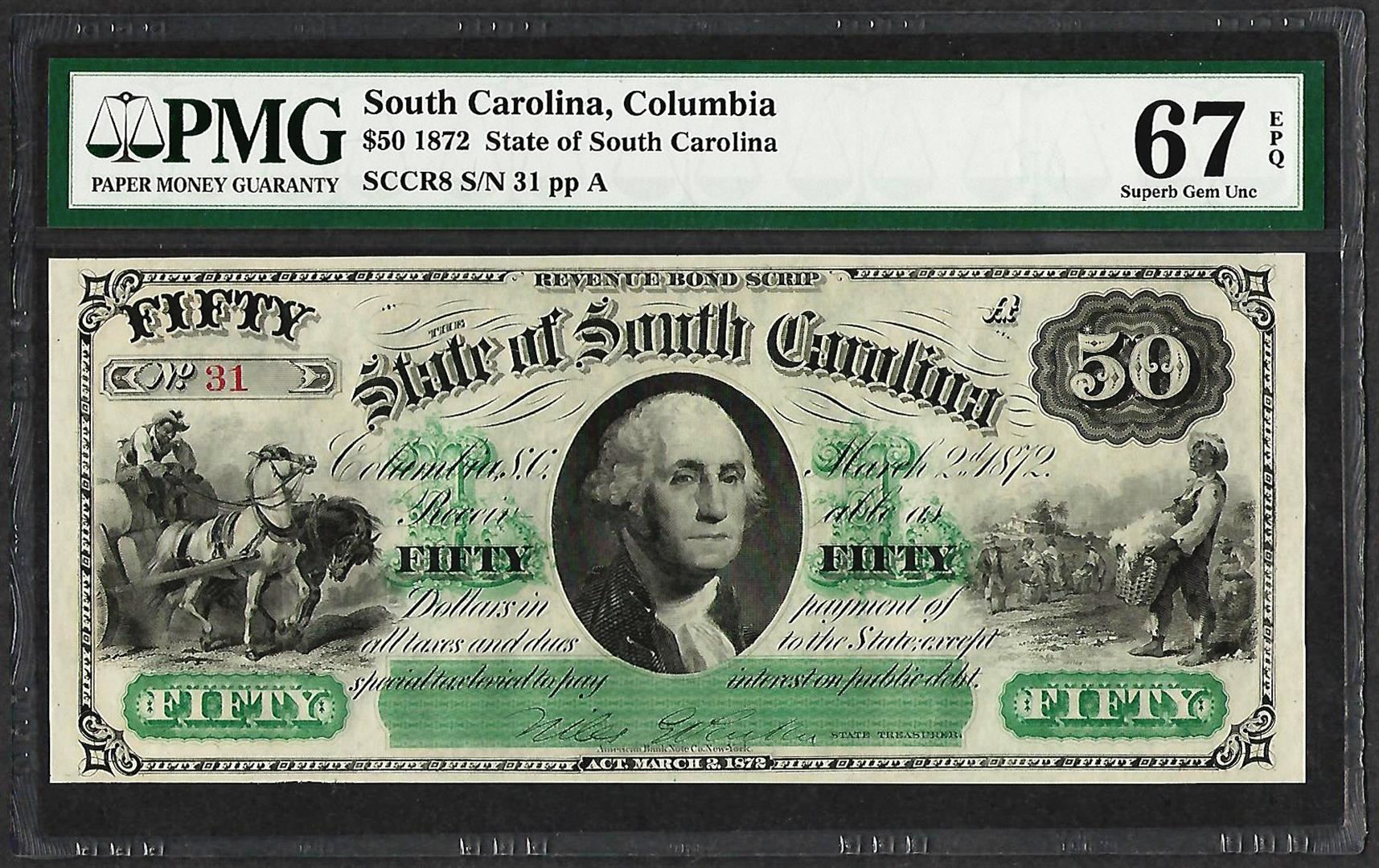 1872 $50 State of South Carolina Revenue Bond Obsolete Note PMG Superb Gem Unc. 67EPQ