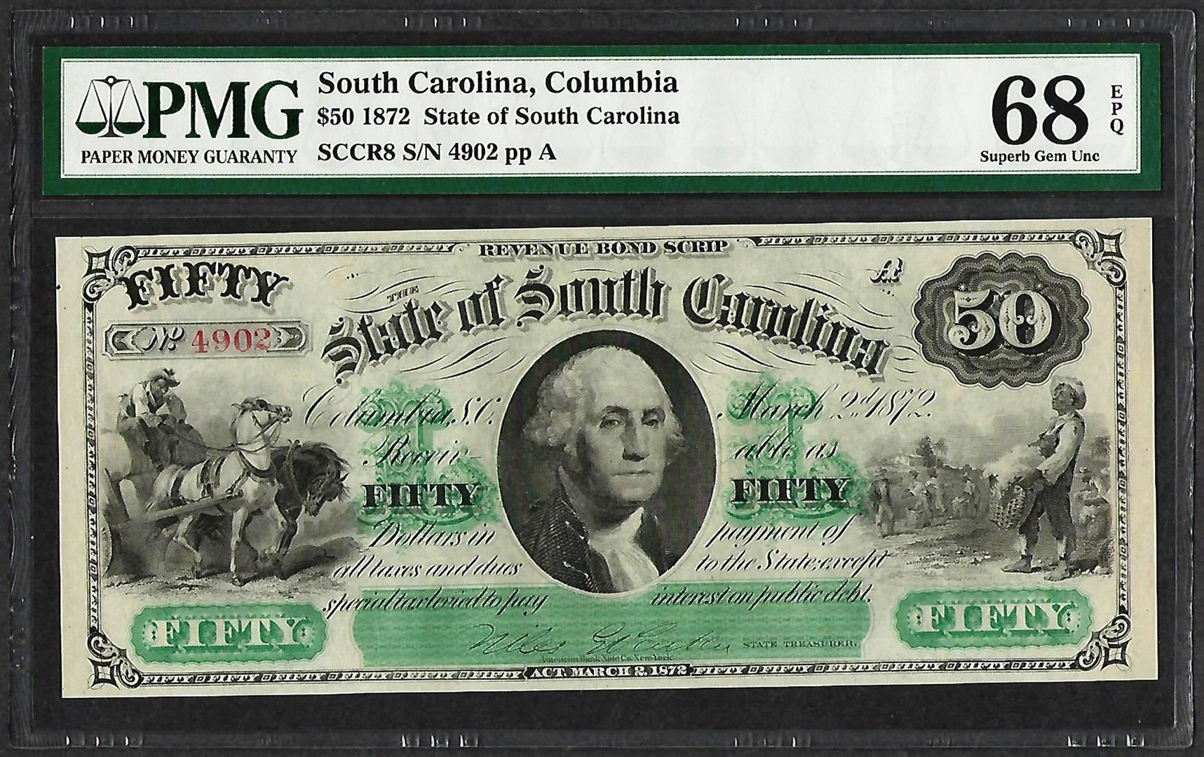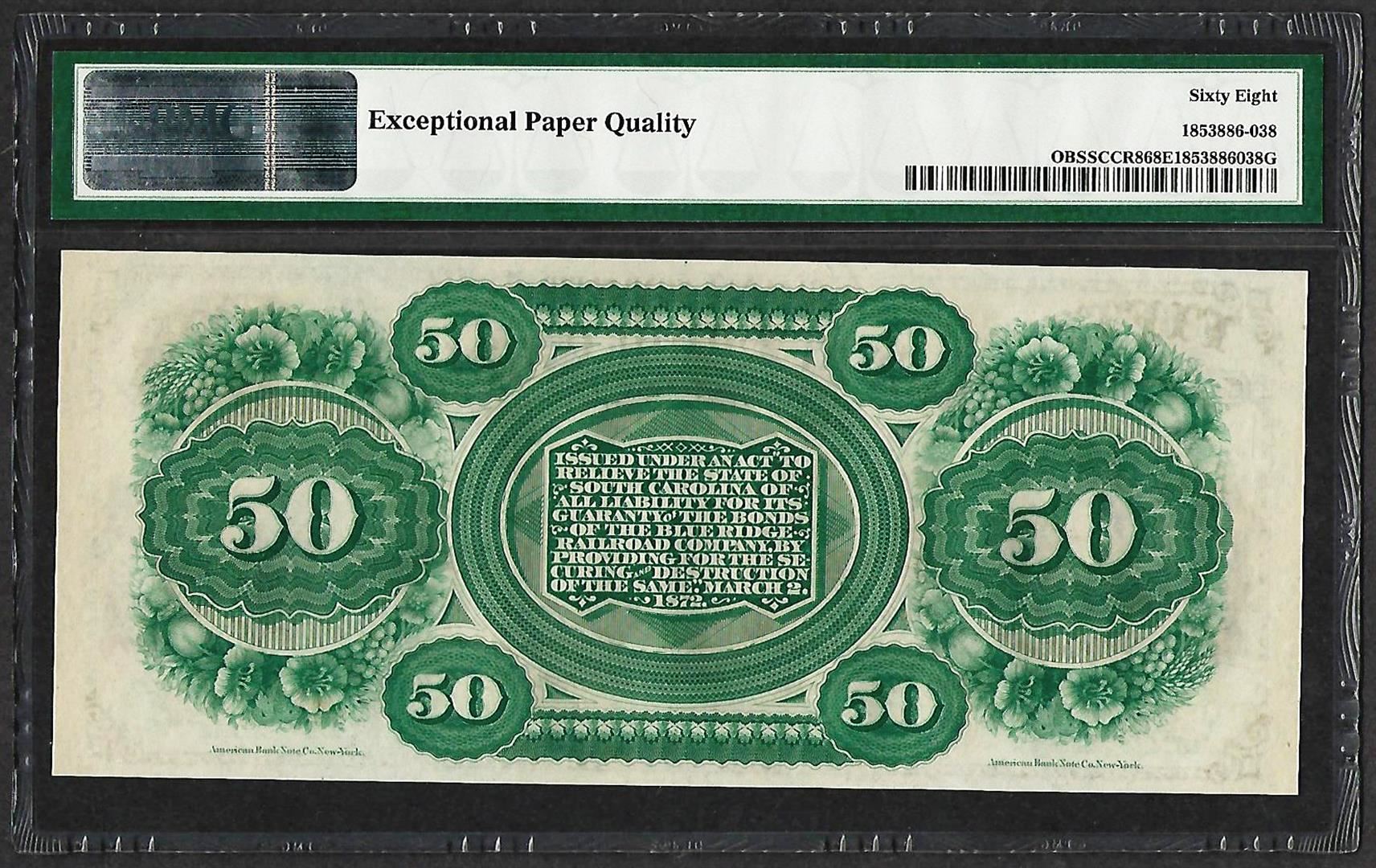 1872 $50 State of South Carolina Revenue Bond Obsolete Note PMG Superb Gem Unc. 68EPQ