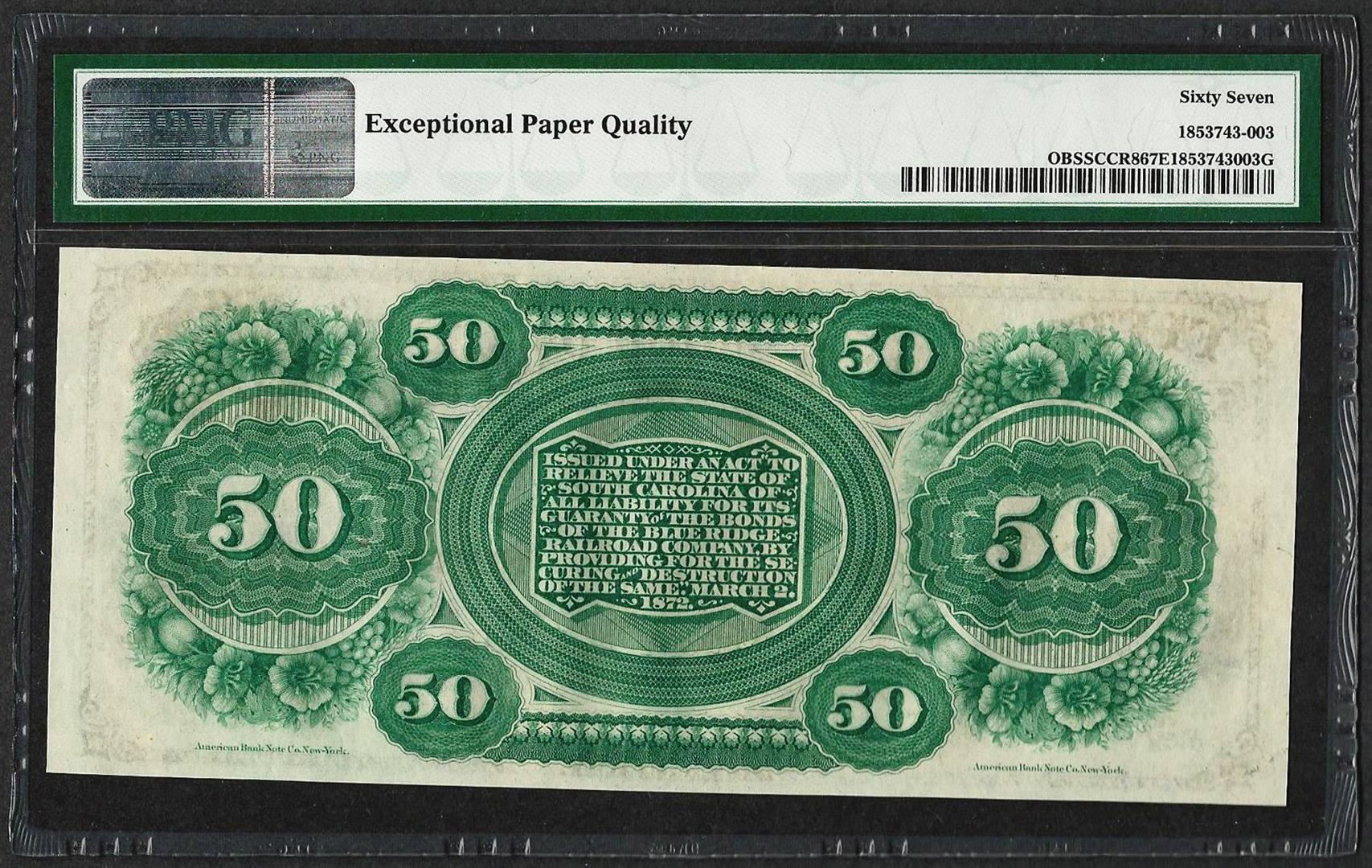 One 1872 $50 State of South Carolina Revenue Bond Obsolete Note PMG Superb Gem Unc. 67EPQ. PMG Certified.