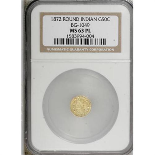 <B>1872 50C Indian Round 50 Cents, BG-1049, R.4, MS63 Prooflike NGC.</B></I> NGC Census: (0/0). (#710878)<BR><BR><b>Shipping:</b> Coins & Currency (<a target="_blank" href="http://www.heritageauctions.com/common/shipping.php">view shipping information</a>)