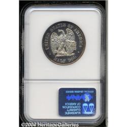 <B>1872<50C> Half Dollar, Judd-1200, Pollock-1340, Low R.7, PR66 NGC.</B></I> A representation of Liberty is seated left on the obverse with her right hand outstretched and resting on the head of an eagle. Her left hand holds a sword, and that arm is propped up on a shield. Thirteen stars encircle the border and the date 1872 is below. The reverse depicts an eagle with spread wings and three arrows in its right talon. The left talon supports a shield, in front of which is an olive branch and over which is draped a ribbon inscribed with the motto IN GOD WE TRUST. The legend UNITED STATES OF AMERICA is at the upper border and the denomination HALF DOL is at the lower border. Struck in silver with a reeded edge.<BR> The Amazonian patterns of 1872 are attributed to William Barber. Long considered one of the most beautiful designs in U.S. coinage history, the term "Amazonian" appears to have originated with the Lorin G. Parmelee Collection Sale of June 1890. The catalogers for that sale, H. P. Smith and David Proskey, apparently likened Liberty to the mythical female Amazonian warriors because of her warlike pose with sword and shield. No more than 12 examples of the present variety are believed extant, some of which have been owned by such numismatic luminaries as William H. Woodin, Harry W. Bass, Jr., King Farouk of Egypt, and Byron Reed.<BR> This important Gem is the single finest certified 1872 Judd-1200 Amazonian Half Dollar at NGC and PCGS (10/02). Hazy apricot-gray toning drifts over both sides with blushes of lavender color at the left borders. We have no complaints about the sharp strike, and both sides are distraction-free save for an obverse spot in the field above the eagle's left (facing) wing that should be useful for pedigree purposes.<BR><I>Ex: Robert E. Branigan Estate Sale (Bowers and Ruddy, 8/1978), lot 1859; William R. Sieck Collection (Bowers and Ruddy, 7-8/1981), lot 224.</B></I><BR><I>From the Harold Hoogasian Collection.</B></I> <BR><BR><B>Important notice:</B> Heritage usually auctions material at the rate of 200-250 lots per hour. On some occasions eBay Live bid software or the Internet may not be able to keep up with the pace of the auction. We recommend placing a realistic absentee bid now as insurance to avoid disappointment. Occasionally the auctioneer may eliminate or reject an eBay Live bid, and the auctioneer may also reopen a lot after the close of the eBay live bidding (usually because we missed an audience bid), and may reject your bid even if it shows you as the winning bidder. By bidding via eBay Live, you agree that Heritage may award the lot to another bidder at its sole discretion under the circumstances described above or any other reasonable circumstances. Since eBay bids are not shown to us until we open the lot on the floor, we treat those bids just like floor bids. In most cases the floor responds before the eBay bid is presented to us, due to Internet lag time, so for consistency we have made it a policy that floor bids are always considered first over tie eBay live bids. Also please note that all Heritage lots purchased through eBay Live carry a 20% Buyer's Premium. Please make sure you read the Terms and Conditions before you bid.