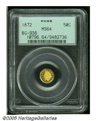 <B>1872<50C> Indian Octagonal 50 Cents, BG-938, Low R.6, MS64 PCGS.</B></I> Sharply struck with intensely prooflike fields and medallic die alignment. Very well preserved. Housed in a green label holder.
