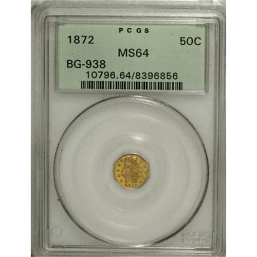 <B>1872 50C Indian Octagonal 50 Cents, BG-938, Low R.6, MS64 PCGS.</B></I> The prooflike fields are toned rich honey-gold. Precisely struck and original with excellent eye appeal. Struck with medal turn, and housed in a green label holder. Population: 4 in 64, 1 finer (8/07).<BR><BR><b>Shipping:</b> Coins & Currency (<a target="_blank" href="http://www.heritageauctions.com/common/shipping.php">view shipping information</a>)
