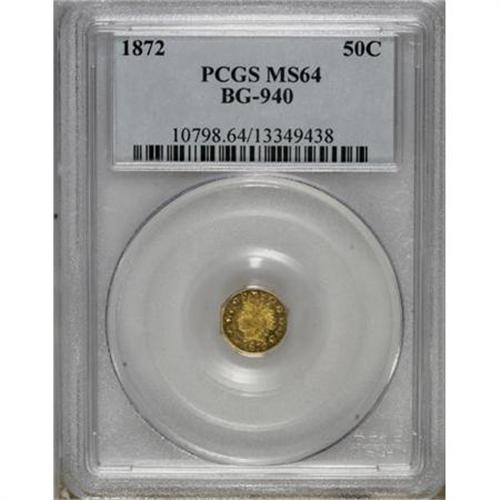 <B>1872 50C Indian Octagonal 50 Cents, BG-940, R.4, MS64 PCGS.</B></I> Well-defined with strong, pleasing luster and excellent preservation. The primarily yellow-gold surfaces show occasional tinges of green and orange on each side. Population: 24 in 64, 9 finer (2/08).<BR><BR><b>Shipping:</b> Coins & Currency (<a target="_blank" href="http://www.heritageauctions.com/common/shipping.php">view shipping information</a>)