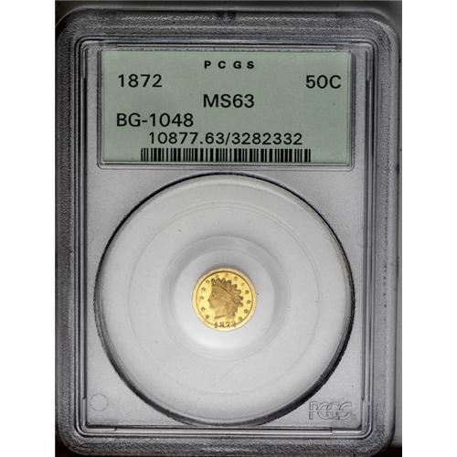 <B>1872<50C> Indian Round 50 Cents, BG-1048, Low R.4, MS63 PCGS.</B></I> A lovely yellow-gold example, identifiable by a thin retained lamination near the chin. The A in DOLLAR is softly struck, as it is opposite the high relief cheekbone. Housed in a green label holder, and struck from rotated dies.<BR><I>Ex: Bowers and Merena, 1/95, lot 3204.</B></I>
