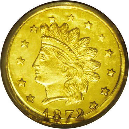 <B>1872<50C> Indian Round 50 Cents, BG-1048, Low R.4, MS65 PCGS.</B></I> Nicely reflective with slight contrast, just shy of prooflike status. The yellow-orange surfaces of this Gem are virtually mark-free. Population: 7 in 65, 0 finer (7/06).