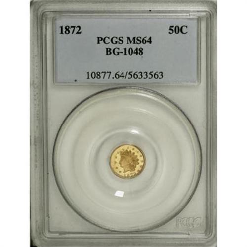 <B>1872 50C Indian Round 50 Cents, BG-1048, Low R.4, MS64 PCGS.</B></I> This is an impressive near-Gem with prooflike surfaces and boldly struck devices that betray slight die weakness on LLA and CAL. The obverse and reverse dies are rotated almost a full 180 degrees. Surface marks are minor, for the grade. Population: 23 in 64, 6 finer (12/07).<BR><BR><b>Shipping:</b> Coins & Currency (<a target="_blank" href="http://www.heritageauctions.com/common/shipping.php">view shipping information</a>)