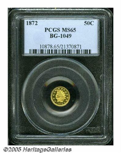 <B>1872<50C> Indian Round 50 Cents, BG-1049, R.4, MS65 PCGS.</B></I> A gorgeous canary-gold Gem with flashy mirrored fields and nearly undisturbed surfaces. Crisply struck and impressive. Population: 5 in 65, 0 finer (6/05).