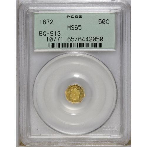 <B>1872 50C Liberty Octagonal 50 Cents, BG-913, R.4, MS65 PCGS.</B></I> An appealing Gem example of this very scarce variety that has modestly reflective amber-gold fields. The strike is above-average for this octagonal issue. Population: 14 in 65, 3 finer (12/06).<BR><BR><b>Shipping:</b> Coin/Currency (<a target="_blank" href="http://www.heritageauctions.com/common/shipping.php">view shipping information</a>)