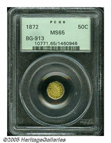 <B>1872<50C> Liberty Octagonal 50 Cents, BG-913, R.4, MS65 PCGS.</B></I> An older holder Gem, generally lime-green in color although bright peach hues adorn the borders. Well struck, and only a faint mark above the coronet tip is worthy of passing mention. Population: 14 in 65, 2 finer (3/05).
