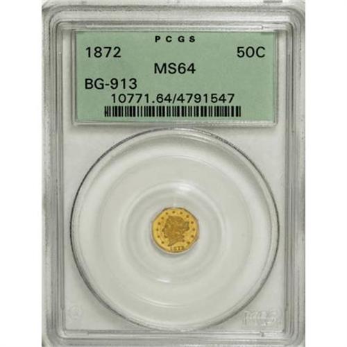 <B>1872 50C Liberty Octagonal 50 Cents, BG-913, R.4, MS64 PCGS.</B></I> Bright lemon-gold color and prominently mirrored fields announce the quality of this beautifully preserved near-Gem. Certified in an older generation holder. Population: 19 in 64, 18 finer (7/07).<BR><BR><b>Shipping:</b> Coins & Currency (<a target="_blank" href="http://www.heritageauctions.com/common/shipping.php">view shipping information</a>)
