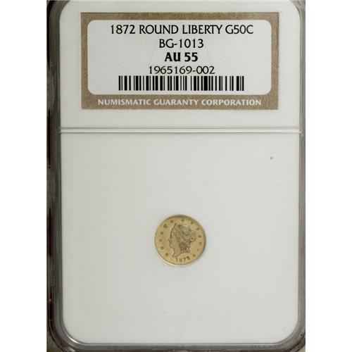 <B>1872 50C Liberty Round 50 Cents, BG-1013, Low R.6, AU55 NGC.</B></I> NGC Census: (1/2). PCGS Population (1/12). (#10842)<BR><BR><b>Shipping:</b> Coins & Currency (<a target="_blank" href="http://www.heritageauctions.com/common/shipping.php">view shipping information</a>)