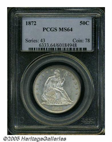 <B>1872<50C> MS64 PCGS.</B></I> Essentially untoned with nicely frosted features that are very well defined and without appreciable marks. Only a few dozen Uncirculated examples appear to have survived of this issue and perhaps fewer than ten Gems are extant. Population: 7 in 64, 7 finer (6/05).