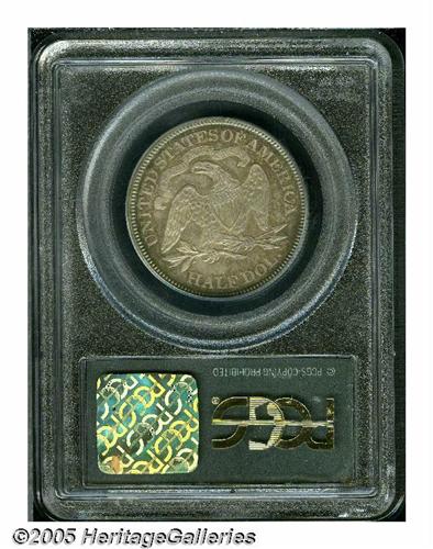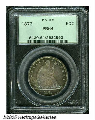 <B>1872<50C> PR64 PCGS.</B></I> Flashy blue peripheries frame the lovely violet and orange surfaces of this near-Gem proof example, especially on the obverse. Essentially problem free for the grade. Population: 37 in 64, 13 finer (6/05).