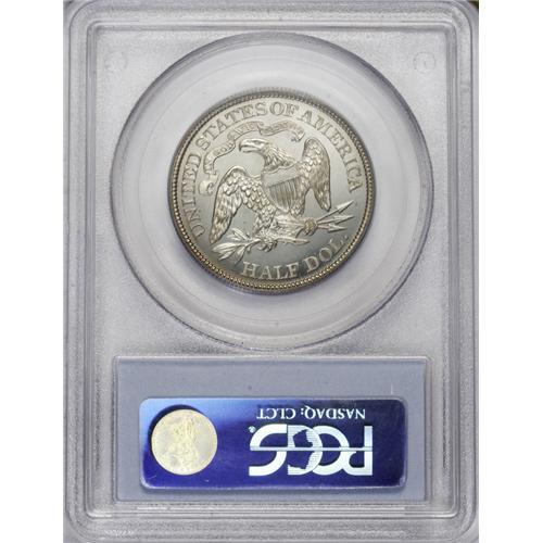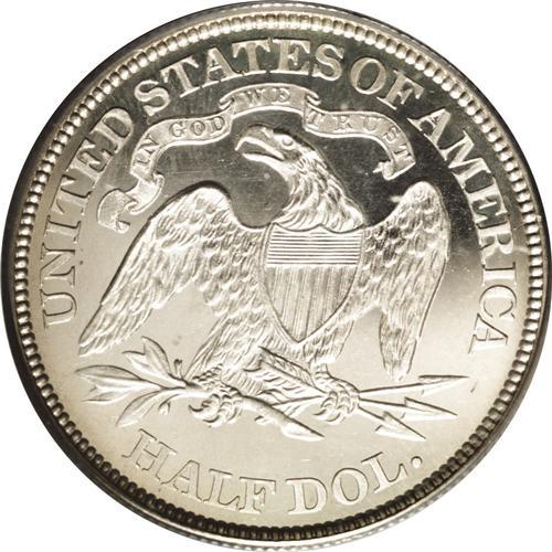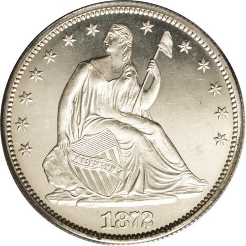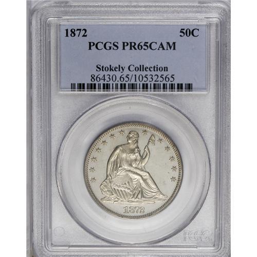 <B>1872<50C> PR65 Cameo PCGS.</B></I> An instantly appealing piece for those who like their coins "straight up," with absolutely no trace of toning, brilliantly mirrored fields, and icy frost on the devices. This is the "low date" as described in Breen's proof <I>Encyclopedia,</B></I> with the 87 joined by a defect, and the toe unenclosed. On the reverse the beak is partly filled, and there are rust pits near the chief shield point and in the E of UNITED. Among the finest graded at PCGS. Population: 3 in 65 Cameo, 0 finer (7/06).<BR><I>From The Stephen Stokely #1 PCGS Registry Set of Proof Seated Half Dollars.</B></I>