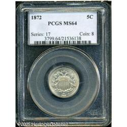 <B>1872 5C MS64 PCGS.</B></I> Frosty and brilliant with outstanding aesthetic appeal. A minor planchet lamination is located northeast of the slightly repunched date. Population: 74 in 64, 39 finer (1/05). Lot:5838