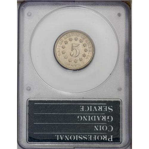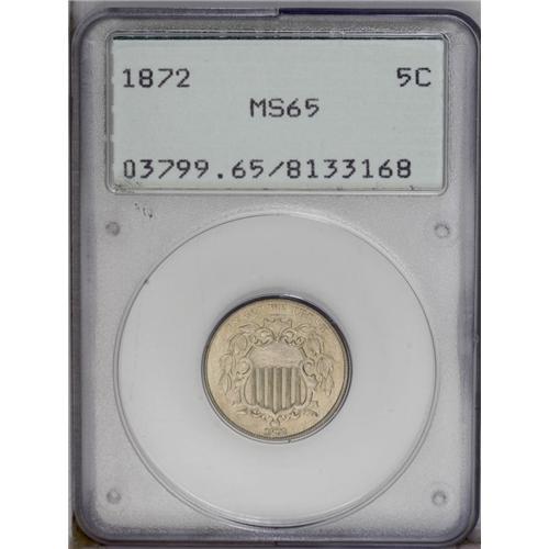 <B>1872<5C> MS65 PCGS.</B></I> Satiny with excellent sharpness for this heavily produced date and a thin veil of specked golden patina. A small carbon spot is attached to the arrow tip on the lower right portion of the shield. Population: 39 in 65, 10 finer (3/06). <BR><BR><B>Important notice:</B> Heritage usually auctions material at the rate of 200-250 lots per hour. On some occasions eBay Live bid software or the Internet may not be able to keep up with the pace of the auction. We recommend placing a realistic absentee bid now as insurance to avoid disappointment. Occasionally the auctioneer may eliminate or reject an eBay Live bid, and the auctioneer may also reopen a lot after the close of the eBay live bidding (usually because we missed an audience bid), and may reject your bid even if it shows you as the winning bidder. By bidding via eBay Live, you agree that Heritage may award the lot to another bidder at its sole discretion under the circumstances described above or any other reasonable circumstances. Since eBay bids are not shown to us until we open the lot on the floor, we treat those bids just like floor bids. In most cases the floor responds before the eBay bid is presented to us, due to Internet lag time, so for consistency we have made it a policy that floor bids are always considered first over tie eBay live bids. Also please note that all Heritage lots purchased through eBay Live carry a 20% Buyer's Premium. Please make sure you read the Terms and Conditions before you bid. This lot is being auctioned in conjunction with a live floor auction by Heritage Galleries & Auctioneers. All final auction and invoice information will be supplied by Heritage Galleries & Auctioneers, and all other information should be considered preliminary. Lot:855 <BR><BR><B>Winning Notification and Billing:</B> After the FINAL session in this auction is complete, Heritage will send e-mail and snail mail invoices. This process normally takes several days. All final auction and invoice information will be supplied by Heritage Galleries & Auctioneers, and all other information should be considered preliminary. <BR><BR>This auction will be conducted on a live auction floor and over the Internet through eBay Live. If you choose to place an absentee bid, please take a moment to <font color='#0000ff'><u><a href='http://pages.ebay.com/liveauctions/help/before/laabsentee.html'>learn how eBay Live absentee bidding works</a></u></font><font color='#000000'>