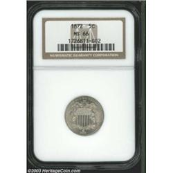 <TR><TD width="100%"><TABLE cellSpacing=1 cellPadding=3 width="100%" border=0><TBODY><TR><TD width="100%" bgColor=#79735c><FONT face=arial color=#ffffff size=3><B>Description</B> </FONT></TD></TR><TR><TD width="100%" bgColor=#ffffff><FONT face=arial size=2><B>1872 5C MS66 NGC.</B></I> Sharply defined with a bright, satiny appearance and a few interesting peripheral die cracks on each side. This untoned Gem is among the nicest '72 Nickels we have seen or offered. Population: 7 in 66, 1 finer (4/03). </FONT></TD></TR></TBODY></TABLE></TD></TR></TBODY></TABLE><BR><A name=PricesRealized></A><TABLE cellSpacing=0 cellPadding=0 width="100%" bgColor=#000000 border=0><TBODY><TR><TD width="100%"><TABLE cellSpacing=1 cellPadding=3 width="100%" border=0><TBODY><TR><TD width="100%" bgColor=#79735c><A name=PR><FONT face=arial color=#ffffff size=3><B>Previous Prices from Heritage Auctions</B> </FONT></A></TD></TR><TR><TD bgColor=#f6f6ed><TABLE cellSpacing=0 cellPadding=0 width="100%" border=1><TBODY><TR><TD align=middle width="33%"><B>Date</B></TD><TD align=middle width="33%"><B>Service</B></TD><TD align=middle width="33%"><B>Price</B></TD></TR><TR bgColor=whitesmoke><TD width="33%"><B>08/13/1999</B></TD><TD width="33%">PCGS</TD><TD width="33%">$1,610.00</TD></TR><TR bgColor=whitesmoke><TD width="33%"><B>11/23/2002</B></TD><TD width="33%">NGC</TD><TD width="33%">$1,265.00</TD></TR><TR bgColor=whitesmoke><TD width="33%"><B>11/18/2000</B></TD><TD width="33%">NGC</TD><TD width="33%">$1,322.50</TD></TR></TBODY></TABLE></TD></TR><TR><TD bgColor=#ffffff><FONT face=arial size=1 ?>PLEASE NOTE: All prices realized reflect the final hammer price PLUS the buyer's premium in auctions that charge a buyer's premium. Each item has a notation at the top of the listing indicating whether that lot included a buyer's premium. Example: A item that sells with a final hammer price of $100 and a 20% buyer's premium will display with a price realized of $120. All information listed is intended to be as accurate as possible, but errors are possible. Please use this guide carefully and inform us of any inaccuracies. </FONT></TD></TR></TBODY></TABLE></TD></TR></TBODY></TABLE><BR><TABLE cellSpacing=0 cellPadding=0 width="100%" bgColor=#000000 border=0><TBODY><TR><TD width="100%"><TABLE cellSpacing=1 cellPadding=3 width="100%" border=0><TBODY><TR><TD width="100%" bgColor=#79735c colSpan=6><FONT face=arial color=#ffffff size=3><B>Price Guide*</B> </FONT></TD></TR><TR bgColor=#f6f6ed><TD align=middle><B>Grade</B> </TD><TD align=middle><B>Coin World<BR>(Trends)</B> </TD><TD align=middle><B>Numismedia<BR>Retail</B> </TD><TD align=middle><B>Numismedia<BR>Wholesale</B> </TD><TD align=middle><B>Coin<BR>Universe</B> </TD><TD align=middle><B>Heritage<BR>Value Index</B> </TD></TR><TR bgColor=#ffffff><TD align=middle>65</TD><TD align=right>$1,000.00</TD><TD align=right>---</TD><TD align=right>$900.00</TD><TD align=right>$1,050.00</TD><TD align=right>$672.50</TD></TR><TR style="FONT-WEIGHT: bold" bgColor=#cccfdd><TD align=middle>66</TD><TD align=right>$2,300.00</TD><TD align=right>---</TD><TD align=right>$1,550.00</TD><TD align=right>$2,175.00</TD><TD align=right>$1,566.25</TD></TR><TR bgColor=#ffffff><TD align=middle>67</TD><TD align=right>---</TD><TD align=right>---</TD><TD align=right>---</TD><TD align=right>---</TD><TD align=right>---</TD></TR><TR bgColor=#ffffff><TD colSpan=6><FONT size=1>*All information listed is intended to be as accurate as possible, but errors are possible. No item may be returned or refused based on this information which is provided as a service to our customers. You should contact each pricing source directly to determine the accuracy of this information. </FONT></TD></TR></TBODY></TABLE></TD></TR></TBODY></TABLE><BR><TABLE cellSpacing=0 cellPadding=0 width="100%" bgColor=#000000 border=0><TBODY><TR><TD width="100%"><TABLE cellSpacing=1 cellPadding=3 width="100%" border=0><TBODY><TR><TD width="100%" bgColor=#79735c><FONT face=arial color=#ffffff size=3><B>Population Guide</B> </FONT></TD></TR><TR bgColor=#ffffff><TD align=middle><!-- Begin Output of Population Grid--><TABLE cellSpacing=0 cellPadding=0 width="100%" border=0><TBODY><TR><TD vAlign=center><TABLE cellSpacing=0 width="100%" border=1 cellsadding="3"><TBODY><TR><TD vAlign=center><TABLE cellSpacing=0 cellPadding=3 width="100%" border=1><TBODY><TR><TD vAlign=center align=middle bgColor=#f0f1e8 colSpan=2 <CENTER><FONT face=Arial size=2><B>PCGS Pop </B></FONT><CENTER></CENTER></TD><TD vAlign=center align=middle bgColor=#f0f1e8 colSpan=2><CENTER><FONT face=Arial size=2><B>NGC Pop</B></CENTER></FONT></TD></TR><TR><TD vAlign=center><FONT face=Arial size=2>(66)</FONT> </TD><TD vAlign=center align=right><FONT face=Arial size=2>6</FONT> </TD><TD vAlign=center><FONT face=Arial size=2>(66)</FONT> </TD><TD vAlign=center align=right><FONT face=Arial size=2>7</FONT> </TD></TR><TR><TD vAlign=center><FONT face=Arial size=2>(>66)</FONT> </TD><TD vAlign=center align=right><FONT face=Arial size=2>0</FONT> </TD><TD vAlign=center><FONT face=Arial size=2>(>66)</FONT> </TD><TD vAlign=center align=right><FONT face=Arial size=2>1</FONT> </TD></TR></TBODY></TABLE></TD></TR></TBODY></TABLE></TD></TR></TBODY></TABLE><!-- End Output of Population Grid--></TD></TR></TBODY></TABLE></TD></TR></TBODY></TABLE><BR><TABLE cellSpacing=0 cellPadding=0 width="100%" bgColor=#000000 border=0><TBODY><TR> Important notice: We expect to be auctioning lots at the rate of 200-250 per hour. On occasion eBay live bid software cannot keep up with the pace of the auctions where 4-5 lots per minute can hammer down, so we recommend that you place a realistic absentee bid now as insurance to avoid disappointment. Also please note that all Heritage/CAA lots purchased through eBay Live carry a 20% Buyer's Premium. Please make sure you read the Terms and Conditions.