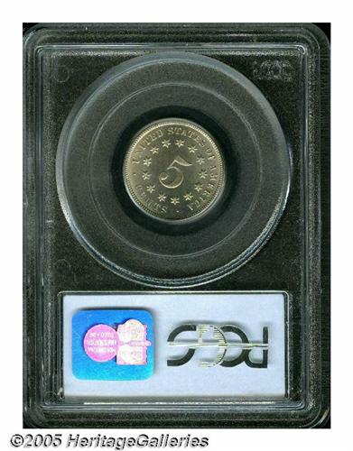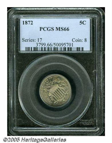 <B>1872<5C> MS66 PCGS.</B></I> Satiny overall with a prominent die crack from 10 o'clock to 2 o'clock on the obverse and just a hint of soft apricot patina on each side. Over 6 million business strikes were minted, but exceptional Gem examples have proven to be quite difficult. Population: 9 in 66, 0 finer (5/05).