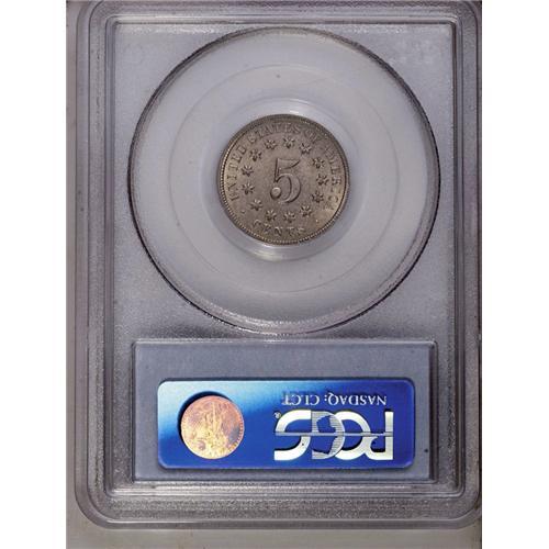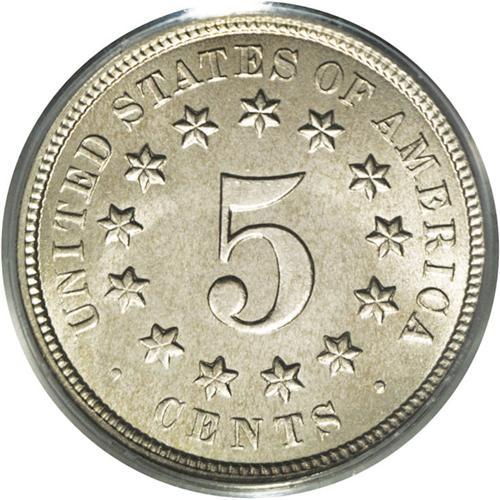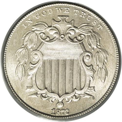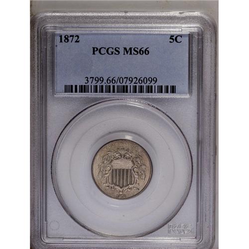 <B>1872<5C> MS66 PCGS.</B></I> The defects on this well preserved coin are Mint-made, although not a recognizable one of the several <I>Cherrypickers'</B></I> varieties for this issue. The digits of the date are quite crowded and close to the rim, and there appear to be extra blobs of metal to the right of the 8 and 7 in the date. Above the 7 there is a small arc that appears to be a repunched numeral of some kind (a 2?). Numerous die cracks are seen throughout the obverse: one joins the legend and cross; another joins the bottoms of the devices; a third runs from the leaves to the rim at 3 o'clock. On the reverse, the stars and legends show strike doubling, and the bottom loop of the S in CENTS is mostly missing, apparently a die defect. The preservation of this coin, fortunately, is in much better shape than its execution, with glowing soft luster and pretty gray-gold patina. Population: 12 in 66, 0 finer (6/06).