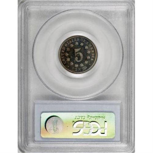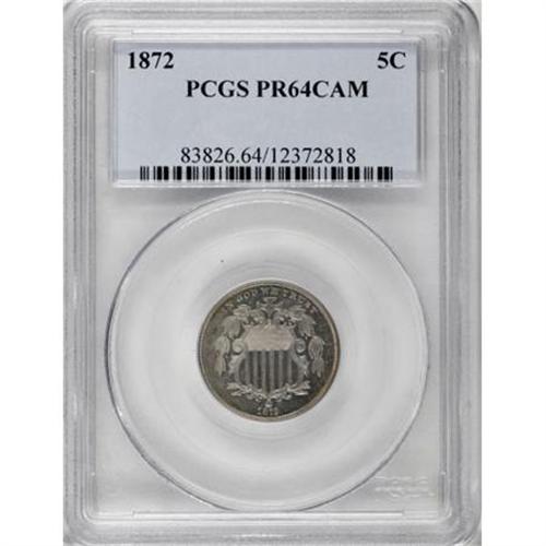 <B>1872 5C PR64 Cameo PCGS.</B></I> Delicate green-gold and canary shadings drape each side of this Choice Cameo proof. A well-defined piece that shows faint, scattered hairlines in the strongly mirrored fields. Population: 8 in 64 Cameo, 33 finer (3/08).<BR><BR><b>Shipping:</b> Coins & Currency (<a target="_blank" href="http://www.heritageauctions.com/common/shipping.php">view shipping information</a>)