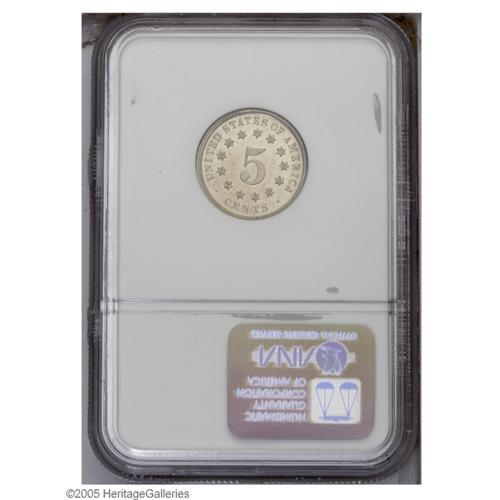<B>1872<5C> PR65 NGC.</B></I> Fletcher-06. A prominently mirrored Gem, lightly toned in honey and pearl colors. Intricately struck, and virtually without hairlines. Similar to FS-007, the obverse is broadly die doubled in a southeastern direction, the pick-up point is the shield annulet.