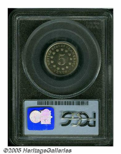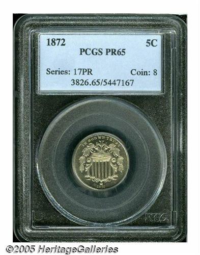 <B>1872<5C> PR65 PCGS.</B></I> FS-007. The leaves and annulet are boldly die doubled. A sharply struck Gem that has mild cameo contrast on the immaculately preserved obverse. The obverse border has a hint of pastel green, rose, and lilac patina. The bottom loop of the S in CENTS is broken, as made and the result of a lapped die. PCGS has graded only 35 finer (3/05).