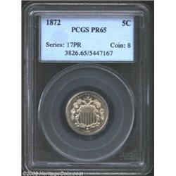 1872 5C PR65 PCGS. FS-7. The leaves and annulet are boldly die doubled. A sharply struck Gem that ha