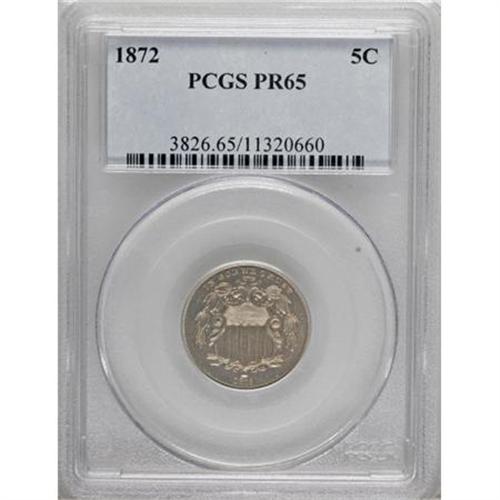 <B>1872 5C PR65 PCGS.</B></I> PCGS Population (108/42). NGC Census: (105/52). Mintage: 950. Numismedia Wsl. Price for NGC/PCGS coin in PR65: $650. (#3826)<BR><BR><b>Shipping:</b> Coins & Currency (<a target="_blank" href="http://www.heritageauctions.com/common/shipping.php">view shipping information</a>)