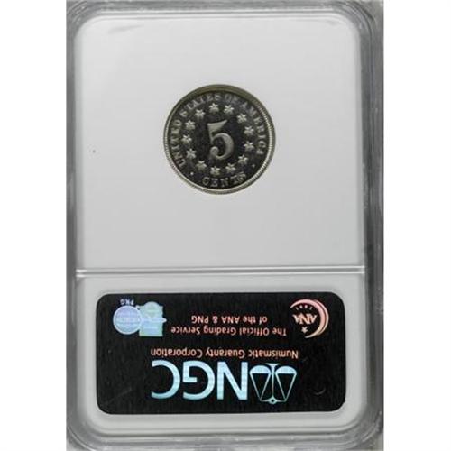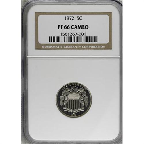 <B>1872 5C PR66 Cameo NGC.</B></I> An especially reflective, spot-free specimen, conducive to the modest degree of contrast visible on each side. Scarce with these qualities. Census: 11 in 66 Cameo, 3 finer (6/07).<BR><BR><b>Shipping:</b> Coins & Currency (<a target="_blank" href="http://www.heritageauctions.com/common/shipping.php">view shipping information</a>\)