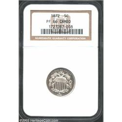 <TR><TD width="100%"><TABLE cellSpacing=1 cellPadding=3 width="100%" border=0><TBODY><TR><TD width="100%" bgColor=#79735c><FONT face=arial color=#ffffff size=3><B>Description</B> </FONT></TD></TR><TR><TD width="100%" bgColor=#ffffff><FONT face=arial size=2><B>1872 5C PR66 Cameo NGC.</B></I> Excellent depth of fields with bold definition. The surfaces are untoned and the only negatives involved here are minor flan flaws that possibly prevent an even higher grade. </FONT></TD></TR></TBODY></TABLE></TD></TR></TBODY></TABLE><BR><A name=PricesRealized></A><TABLE cellSpacing=0 cellPadding=0 width="100%" bgColor=#000000 border=0><TBODY><TR><TD width="100%"><TABLE cellSpacing=1 cellPadding=3 width="100%" border=0><TBODY><TR><TD width="100%" bgColor=#79735c><A name=PR><FONT face=arial color=#ffffff size=3><B>Previous Prices from Heritage Auctions</B> </FONT></A></TD></TR><TR><TD bgColor=#f6f6ed><TABLE cellSpacing=0 cellPadding=0 width="100%" border=1><TBODY><TR><TD align=middle width="33%"><B>Date</B></TD><TD align=middle width="33%"><B>Service</B></TD><TD align=middle width="33%"><B>Price</B></TD></TR><TR bgColor=whitesmoke><TD width="33%"><B>04/15/2003</B></TD><TD width="33%">PCGS</TD><TD width="33%">$1,782.50</TD></TR><TR bgColor=whitesmoke><TD width="33%"><B>11/23/2002</B></TD><TD width="33%">NGC</TD><TD width="33%">$1,610.00</TD></TR></TBODY></TABLE></TD></TR><TR><TD bgColor=#ffffff><FONT face=arial size=1 ?>PLEASE NOTE: All prices realized reflect the final hammer price PLUS the buyer's premium in auctions that charge a buyer's premium. Each item has a notation at the top of the listing indicating whether that lot included a buyer's premium. Example: A item that sells with a final hammer price of $100 and a 20% buyer's premium will display with a price realized of $120. All information listed is intended to be as accurate as possible, but errors are possible. Please use this guide carefully and inform us of any inaccuracies. </FONT></TD></TR></TBODY></TABLE></TD></TR></TBODY></TABLE><BR><TABLE cellSpacing=0 cellPadding=0 width="100%" bgColor=#000000 border=0><TBODY><TR><TD width="100%"><TABLE cellSpacing=1 cellPadding=3 width="100%" border=0><TBODY><TR><TD width="100%" bgColor=#79735c colSpan=6><FONT face=arial color=#ffffff size=3><B>Price Guide*</B> </FONT></TD></TR><TR bgColor=#f6f6ed><TD align=middle><B>Grade</B> </TD><TD align=middle><B>Coin World<BR>(Trends)</B> </TD><TD align=middle><B>Numismedia<BR>Retail</B> </TD><TD align=middle><B>Numismedia<BR>Wholesale</B> </TD><TD align=middle><B>Coin<BR>Universe</B> </TD><TD align=middle><B>Heritage<BR>Value Index</B> </TD></TR><TR bgColor=#ffffff><TD align=middle>65</TD><TD align=right>---</TD><TD align=right>---</TD><TD align=right>---</TD><TD align=right>$900.00</TD><TD align=right>$590.00</TD></TR><TR style="FONT-WEIGHT: bold" bgColor=#cccfdd><TD align=middle>66</TD><TD align=right>---</TD><TD align=right>---</TD><TD align=right>---</TD><TD align=right>---</TD><TD align=right>---</TD></TR><TR bgColor=#ffffff><TD align=middle>67</TD><TD align=right>---</TD><TD align=right>---</TD><TD align=right>---</TD><TD align=right>---</TD><TD align=right>---</TD></TR><TR bgColor=#ffffff><TD colSpan=6><FONT size=1>*All information listed is intended to be as accurate as possible, but errors are possible. No item may be returned or refused based on this information which is provided as a service to our customers. You should contact each pricing source directly to determine the accuracy of this information. </FONT></TD></TR></TBODY></TABLE></TD></TR></TBODY></TABLE><BR><TABLE cellSpacing=0 cellPadding=0 width="100%" bgColor=#000000 border=0><TBODY><TR><TD width="100%"><TABLE cellSpacing=1 cellPadding=3 width="100%" border=0><TBODY><TR><TD width="100%" bgColor=#79735c><FONT face=arial color=#ffffff size=3><B>Population Guide</B> </FONT></TD></TR><TR bgColor=#ffffff><TD align=middle><!-- Begin Output of Population Grid--><TABLE cellSpacing=0 cellPadding=0 width="100%" border=0><TBODY><TR><TD vAlign=center><TABLE cellSpacing=0 width="100%" border=1 cellsadding="3"><TBODY><TR><TD vAlign=center><TABLE cellSpacing=0 cellPadding=3 width="100%" border=1><TBODY><TR><TD vAlign=center align=middle bgColor=#f0f1e8 colSpan=2 <CENTER><FONT face=Arial size=2><B>PCGS Pop </B></FONT><CENTER></CENTER></TD><TD vAlign=center align=middle bgColor=#f0f1e8 colSpan=2><CENTER><FONT face=Arial size=2><B>NGC Pop</B></CENTER></FONT></TD></TR><TR><TD vAlign=center><FONT face=Arial size=2>(66)</FONT> </TD><TD vAlign=center align=right><FONT face=Arial size=2>10</FONT> </TD><TD vAlign=center><FONT face=Arial size=2>(66)</FONT> </TD><TD vAlign=center align=right><FONT face=Arial size=2>6</FONT> </TD></TR><TR><TD vAlign=center><FONT face=Arial size=2>(>66)</FONT> </TD><TD vAlign=center align=right><FONT face=Arial size=2>1</FONT> </TD><TD vAlign=center><FONT face=Arial size=2>(>66)</FONT> </TD><TD vAlign=center align=right><FONT face=Arial size=2>0</FONT> </TD></TR></TBODY></TABLE></TD></TR></TBODY></TABLE></TD></TR></TBODY></TABLE><!-- End Output of Population Grid--></TD></TR></TBODY></TABLE></TD></TR></TBODY></TABLE><BR><TABLE cellSpacing=0 cellPadding=0 width="100%" bgColor=#000000 border=0><TBODY><TR> Important notice: We expect to be auctioning lots at the rate of 200-250 per hour. On occasion eBay live bid software cannot keep up with the pace of the auctions where 4-5 lots per minute can hammer down, so we recommend that you place a realistic absentee bid now as insurance to avoid disappointment. Also please note that all Heritage/CAA lots purchased through eBay Live carry a 20% Buyer's Premium. Please make sure you read the Terms and Conditions.