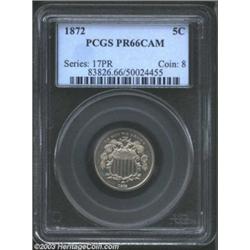 <TABLE cellSpacing=0 cellPadding=0 width="100%" bgColor=#000000 border=0><TBODY><TR><TD width="100%"><TABLE cellSpacing=1 cellPadding=3 width="100%" border=0><TBODY><TR><TD width="100%" bgColor=#79735c><FONT face=arial color=#ffffff size=3><B>Description</B> </FONT></TD></TR><TR><TD width="100%" bgColor=#ffffff><FONT face=arial size=2><B>1872 5C PR66 Cameo PCGS.</B></I> FS-7. The obverse is boldly die doubled, with the annulet as the pick-up point. A well struck and satiny Superb Gem that is essentially perfect aside from a few tiny mint-made planchet flaws. Population: 10 in 66 as Cameo, 1 finer (4/03). </FONT></TD></TR></TBODY></TABLE></TD></TR></TBODY></TABLE><BR><A name=PricesRealized></A><TABLE cellSpacing=0 cellPadding=0 width="100%" bgColor=#000000 border=0><TBODY><TR><TD width="100%"><TABLE cellSpacing=1 cellPadding=3 width="100%" border=0><TBODY><TR><TD width="100%" bgColor=#79735c><A name=PR><FONT face=arial color=#ffffff size=3><B>Previous Prices from Heritage Auctions</B> </FONT></A></TD></TR><TR><TD bgColor=#f6f6ed><TABLE cellSpacing=0 cellPadding=0 width="100%" border=1><TBODY><TR><TD align=middle width="33%"><B>Date</B></TD><TD align=middle width="33%"><B>Service</B></TD><TD align=middle width="33%"><B>Price</B></TD></TR><TR bgColor=whitesmoke><TD width="33%"><B>03/23/2003</B></TD><TD width="33%">PCGS</TD><TD width="33%">$1,955.00</TD></TR><TR bgColor=whitesmoke><TD width="33%"><B>11/23/2002</B></TD><TD width="33%">PCGS</TD><TD width="33%">$1,610.00</TD></TR><TR bgColor=whitesmoke><TD width="33%"><B>11/23/2002</B></TD><TD width="33%">NGC</TD><TD width="33%">$1,610.00</TD></TR></TBODY></TABLE></TD></TR><TR><TD bgColor=#ffffff><FONT face=arial size=1 ?>PLEASE NOTE: All prices realized reflect the final hammer price PLUS the buyer's premium in auctions that charge a buyer's premium. Each item has a notation at the top of the listing indicating whether that lot included a buyer's premium. Example: A item that sells with a final hammer price of $100 and a 20% buyer's premium will display with a price realized of $120. All information listed is intended to be as accurate as possible, but errors are possible. Please use this guide carefully and inform us of any inaccuracies. </FONT></TD></TR></TBODY></TABLE></TD></TR></TBODY></TABLE><BR><TABLE cellSpacing=0 cellPadding=0 width="100%" bgColor=#000000 border=0><TBODY><TR><TD width="100%"><TABLE cellSpacing=1 cellPadding=3 width="100%" border=0><TBODY><TR><TD width="100%" bgColor=#79735c colSpan=6><FONT face=arial color=#ffffff size=3><B>Price Guide*</B> </FONT></TD></TR><TR bgColor=#f6f6ed><TD align=middle><B>Grade</B> </TD><TD align=middle><B>Coin World<BR>(Trends)</B> </TD><TD align=middle><B>Numismedia<BR>Retail</B> </TD><TD align=middle><B>Numismedia<BR>Wholesale</B> </TD><TD align=middle><B>Coin<BR>Universe</B> </TD><TD align=middle><B>Heritage<BR>Value Index</B> </TD></TR><TR bgColor=#ffffff><TD align=middle>65</TD><TD align=right>---</TD><TD align=right>---</TD><TD align=right>---</TD><TD align=right>$900.00</TD><TD align=right>$590.00</TD></TR><TR style="FONT-WEIGHT: bold" bgColor=#cccfdd><TD align=middle>66</TD><TD align=right>---</TD><TD align=right>---</TD><TD align=right>---</TD><TD align=right>---</TD><TD align=right>---</TD></TR><TR bgColor=#ffffff><TD align=middle>67</TD><TD align=right>---</TD><TD align=right>---</TD><TD align=right>---</TD><TD align=right>---</TD><TD align=right>---</TD></TR><TR bgColor=#ffffff><TD colSpan=6><FONT size=1>*All information listed is intended to be as accurate as possible, but errors are possible. No item may be returned or refused based on this information which is provided as a service to our customers. You should contact each pricing source directly to determine the accuracy of this information. </FONT></TD></TR></TBODY></TABLE></TD></TR></TBODY></TABLE><BR><TABLE cellSpacing=0 cellPadding=0 width="100%" bgColor=#000000 border=0><TBODY><TR><TD width="100%"><TABLE cellSpacing=1 cellPadding=3 width="100%" border=0><TBODY><TR><TD width="100%" bgColor=#79735c><FONT face=arial color=#ffffff size=3><B>Population Guide</B> </FONT></TD></TR><TR bgColor=#ffffff><TD align=middle><!-- Begin Output of Population Grid--><TABLE cellSpacing=0 cellPadding=0 width="100%" border=0><TBODY><TR><TD vAlign=center><TABLE cellSpacing=0 width="100%" border=1 cellsadding="3"><TBODY><TR><TD vAlign=center><TABLE cellSpacing=0 cellPadding=3 width="100%" border=1><TBODY><TR><TD vAlign=center align=middle bgColor=#f0f1e8 colSpan=2 <CENTER><FONT face=Arial size=2><B>PCGS Pop </B></FONT><CENTER></CENTER></TD><TD vAlign=center align=middle bgColor=#f0f1e8 colSpan=2><CENTER><FONT face=Arial size=2><B>NGC Pop</B></CENTER></FONT></TD></TR><TR><TD vAlign=center><FONT face=Arial size=2>(66)</FONT> </TD><TD vAlign=center align=right><FONT face=Arial size=2>9</FONT> </TD><TD vAlign=center><FONT face=Arial size=2>(66)</FONT> </TD><TD vAlign=center align=right><FONT face=Arial size=2>6</FONT> </TD></TR><TR><TD vAlign=center><FONT face=Arial size=2>(>66)</FONT> </TD><TD vAlign=center align=right><FONT face=Arial size=2>0</FONT> </TD><TD vAlign=center><FONT face=Arial size=2>(>66)</FONT> </TD><TD vAlign=center align=right><FONT face=Arial size=2>1</FONT> </TD></TR></TBODY></TABLE></TD></TR></TBODY></TABLE></TD></TR></TBODY></TABLE><!-- End Output of Population Grid--> Important notice: Heritage usually auctions material at the rate of 200-250 lots per hour. On some occasions eBay Live bid software or the Internet may not be able to keep up with the pace of the auction. We recommend placing a realistic absentee bid now as insurance to avoid disappointment. Occasionally the auctioneer may eliminate or reject an eBay Live bid, and the auctioneer may also reopen a lot after the close of the eBay live bidding (usually because we missed an audience bid), and may reject your bid even if it shows you as the winning bidder. By bidding via eBay Live, you agree that Heritage may award the lot to another bidder at its sole discretion und