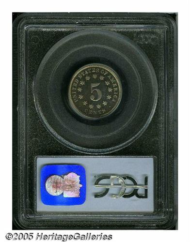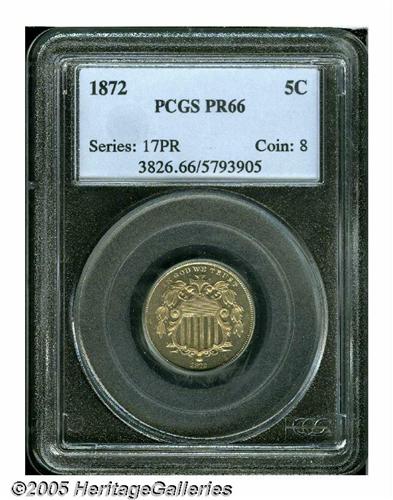 <B>1872<5C> PR66 PCGS.</B></I> Golden-brown toning covers each side of this gorgeous proof. The design features are sharply struck throughout, and the surfaces are expertly preserved. Just one small fleck is noted in the lower right (facing) obverse quadrant. From a mintage of only about 950 pieces. Population: 33 in 66, 2 finer (3/05).