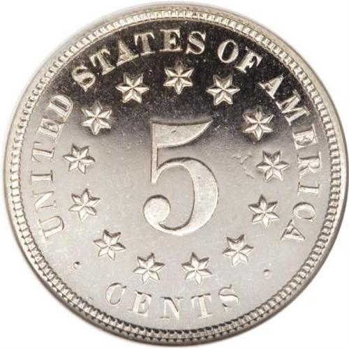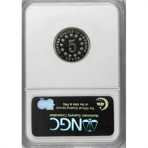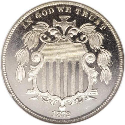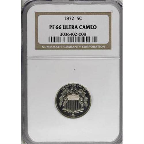 <B>1872 5C PR66 Ultra Cameo NGC.</B></I> Fletcher-06. The upper obverse is die doubled south, most noticeably on the annulet. A lightly toned and prominently mirrored Premium Gem. Although the Shield nickel series closed with fairly large proof mintages, the pre-1878 proofs are scarce. Only 950+ proofs were struck in 1872. The present lot is the only proof 1872 nickel certified as Ultra Cameo by NGC (6/07).<BR><BR><b>Shipping:</b> Coins & Currency (<a target="_blank" href="http://www.heritageauctions.com/common/shipping.php">view shipping information</a>)