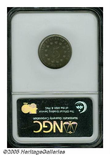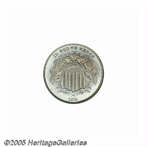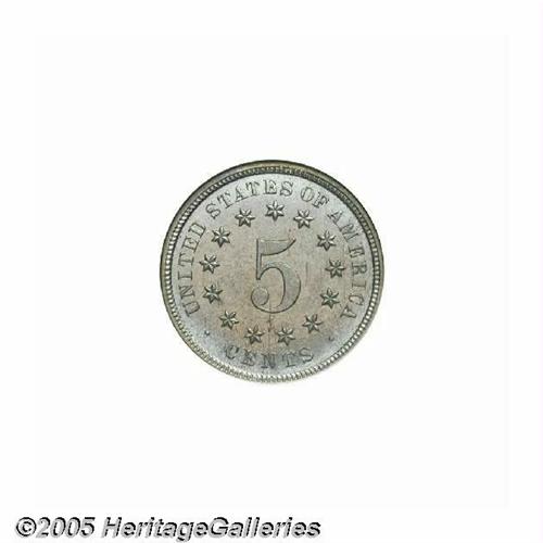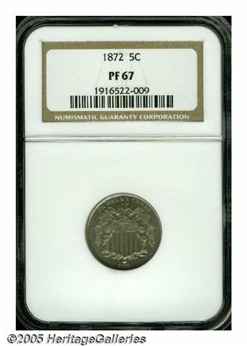 <B>1872<5C> PR67 NGC.</B></I> Delicately toned surfaces incorporate pastel shades of blue and gold, being modestly mirrored and almost perfectly preserved beneath these light layers of color. No doubt in the upper echelon of surviving proofs from this issue of 950 pieces. Population: 4 in 67, 0 finer (6/05).