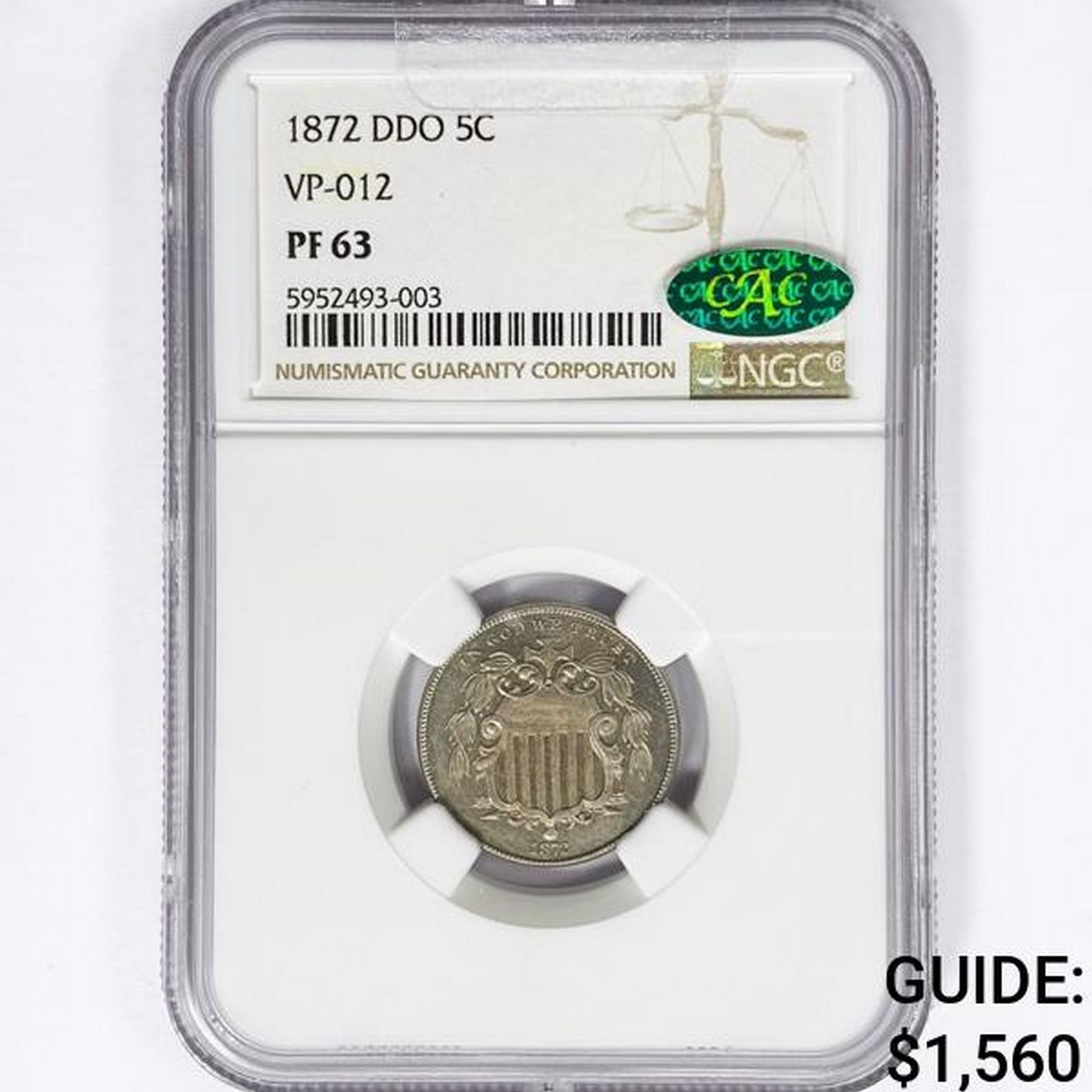 1872 CAC Shield Nickel NGC PF63 DDO