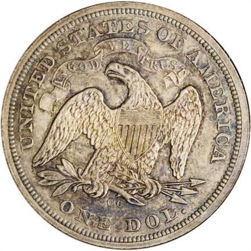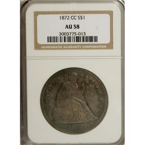 <B>1872-CC $1 AU58 NGC.</B></I> Though the 1872-CC silver dollar has a mintage of 3,150 pieces, many numismatic scholars speculate that under 10% of those coins survive today in any grade. The extant pieces have varying degrees of wear, and any coin that approaches Mint State status is properly considered a condition rarity. While this piece is not strictly Mint State, it comes close, with just a trace of friction apparent on the well struck highpoints. The surfaces have subtle luster beneath deep gray-gold, sapphire, dusty rose, and blue-green patina. The fields have only a few unimportant marks, evidence of only a brief period in circulation, if that. An outstanding example of this elusive issue of Carson City silver. Census: 8 in 58, 14 finer (6/07).<BR><BR><B>Coin Engraver:</B> Christian Gobrecht<BR><BR><b>Shipping:</b> Coins & Currency (<a target="_blank" href="http://www.heritageauctions.com/common/shipping.php">view shipping information</a>\)