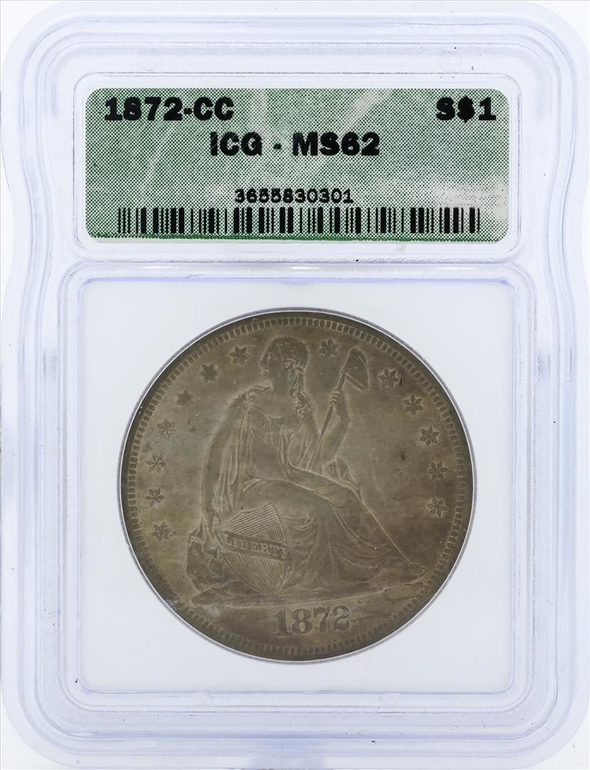 One 1872-CC $1 Seated Liberty Dollar Coin ICG MS62. ICG Certified.