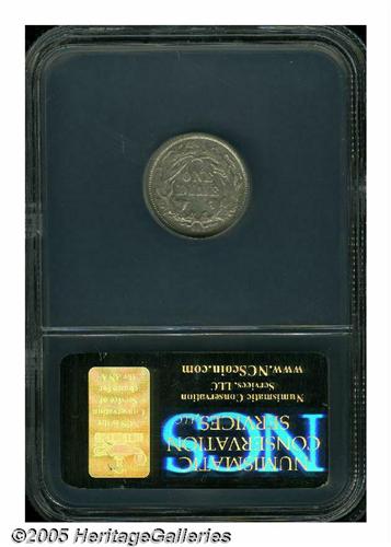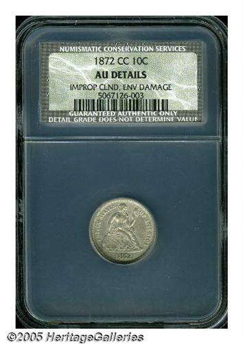 <B>1872-CC<10C> AU Details, Improperly Cleaned, Environmental Damage, NCS.</B></I> A rarely seen CC dime, the 1872-CC is generally regarded as the series key above XF. While this coin has been cleaned and there is evidence of microscopic porosity, the details are of AU quality, which will undoubtedly be of interest to a great many collectors. The Environmental Damage mentioned on the insert may actually be from the coin having been struck from unalloyed Comstock silver, which left these coins susceptible to all manner of surface degradations.<BR><I>From The Empire State Collection.</B></I>