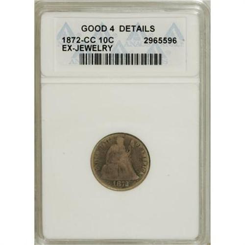<B>1872-CC 10C --Ex-Jewelry--ANACS. Good 4 Details.</B></I> NGC Census: (1/27). PCGS Population (3/38). Mintage: 35,480. Numismedia Wsl. Price for NGC/PCGS coin in G4 : $322. (#4657)<BR><BR><B>Coin Engraver:</B> Christian Gobrecht<BR><BR><b>Shipping:</b> Coins & Currency (<a target="_blank" href="http://www.heritageauctions.com/common/shipping.php">view shipping information</a>)